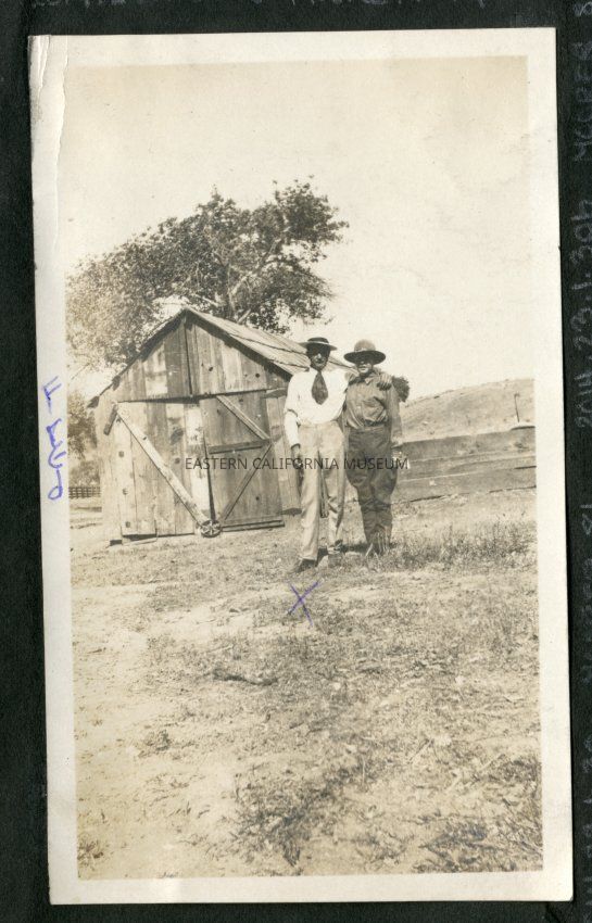 Fred Moore (left) standing with another man in front of a wooden structure (barn or shed?).