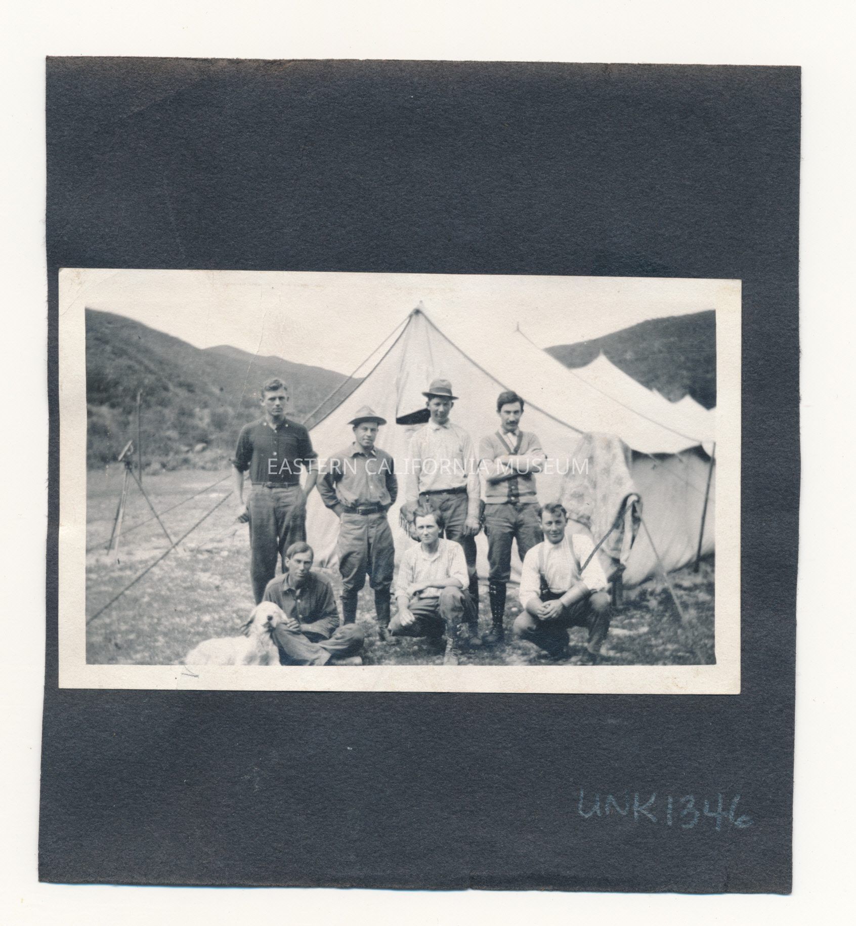 Photo of a group of seven young men standing in front of a white canvas tent. There appears to be some surveying equipment in the the background on the left side, so they may be members of a survey party. Location unknown.