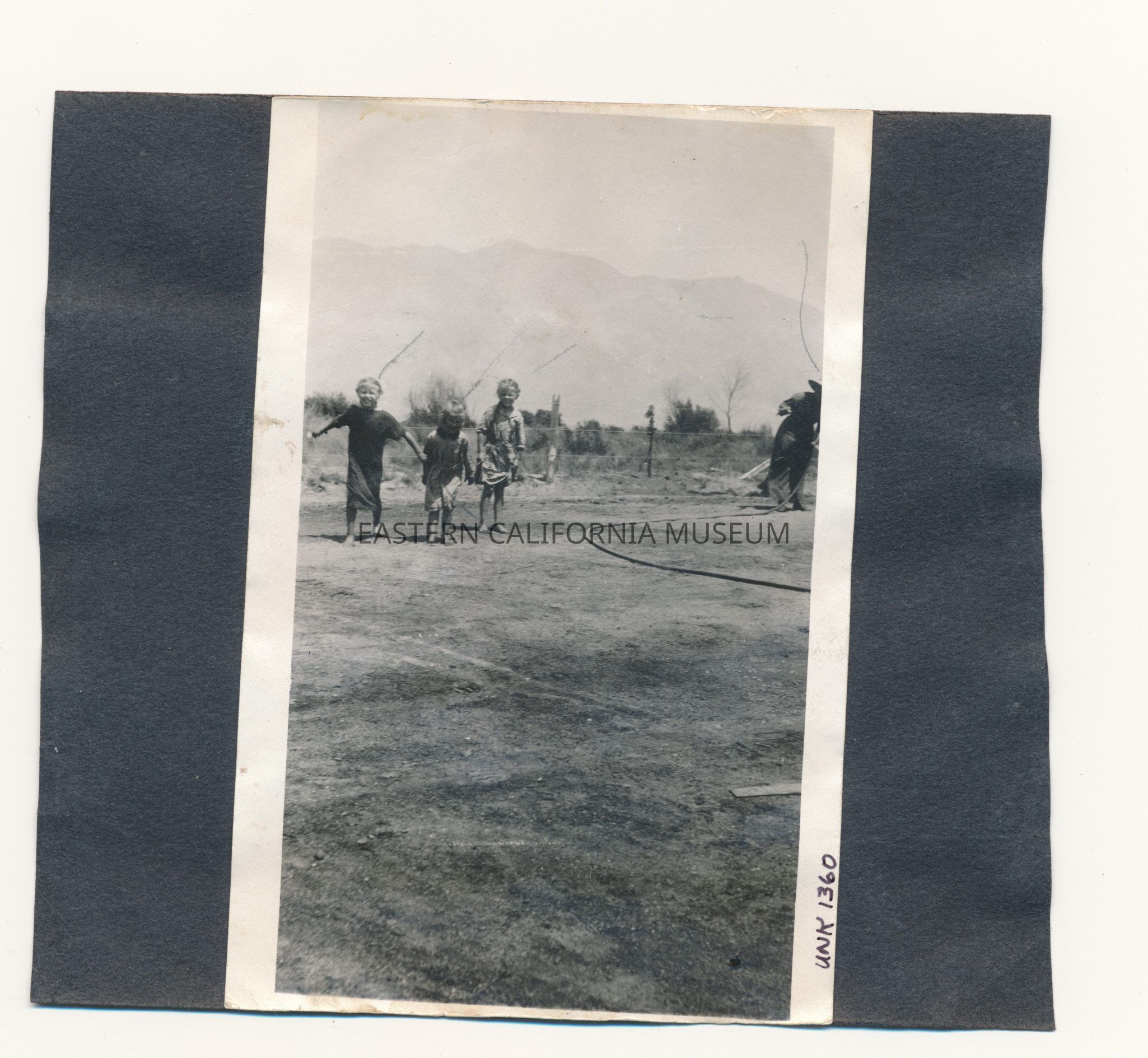 Photo of three children standing barefoot outside. There is a fence (barbed wire?) behind them, and a woman with a hose to the right. Mountains in background. The location may be the Manzanar area.
