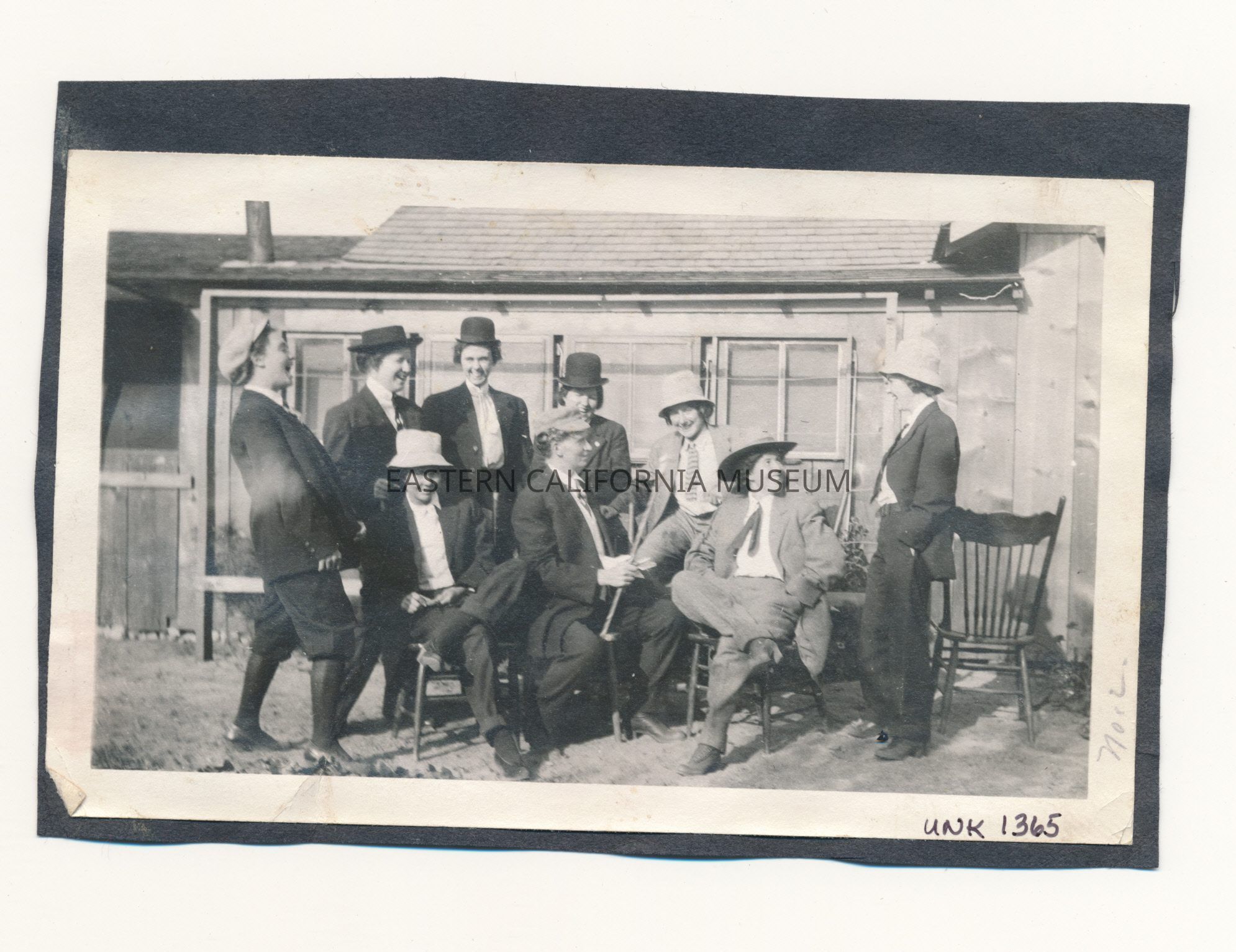 Photo of a group of nine people who appear to be women dressed in men's clothing (pants, white shirts, jackets, ties, and hats). Most of them are laughing and smiling. They are outside in front of a building, and some are sitting on chairs while others stand. The location may be the Manzanar area.