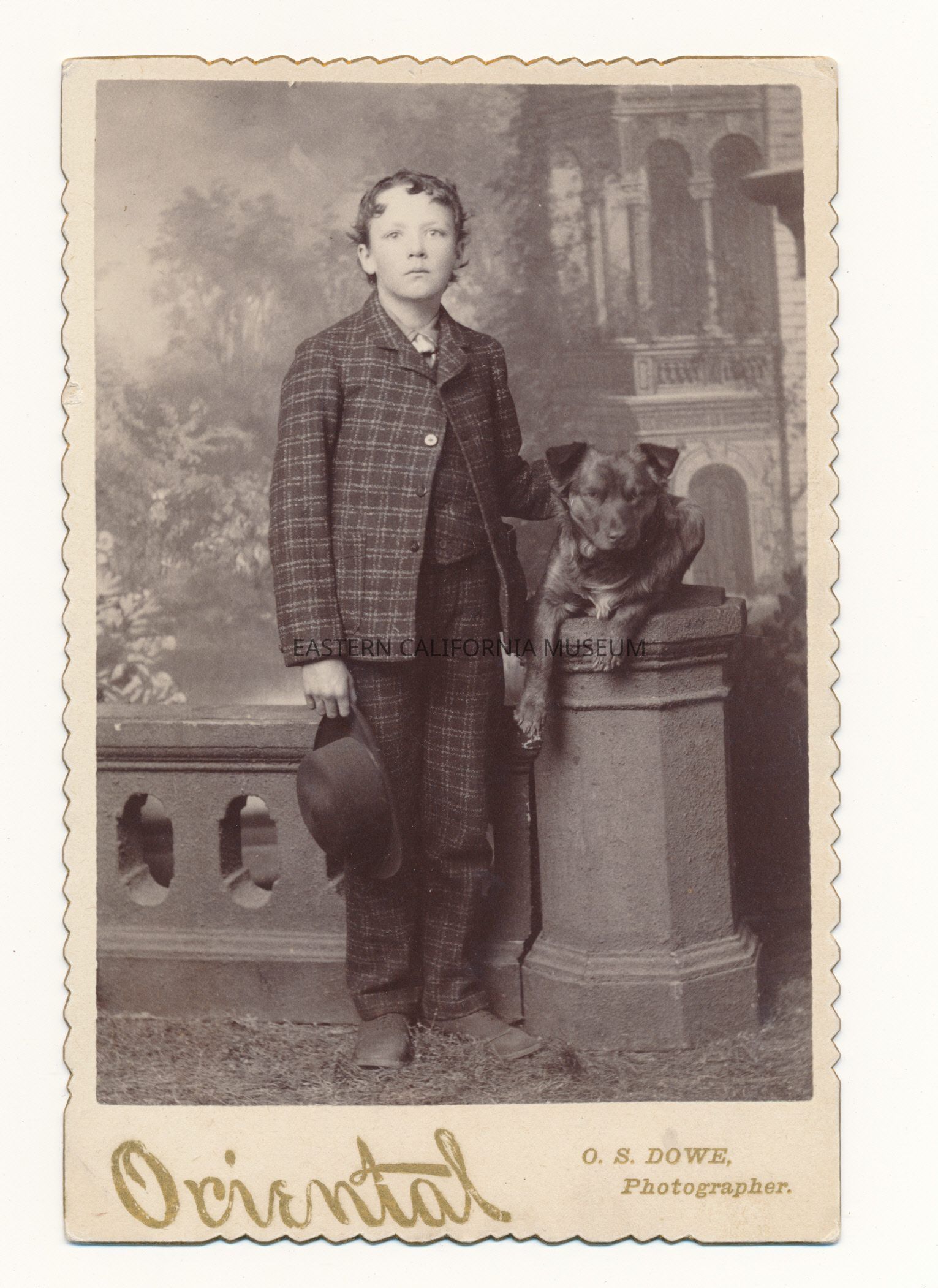 Mounted full length studio portrait of John Moore posing with a dog. He is the son of J. J. Moore, the Postmaster of Independence. Photographer was O. S. Dowe of the Oriental Studio.Collection