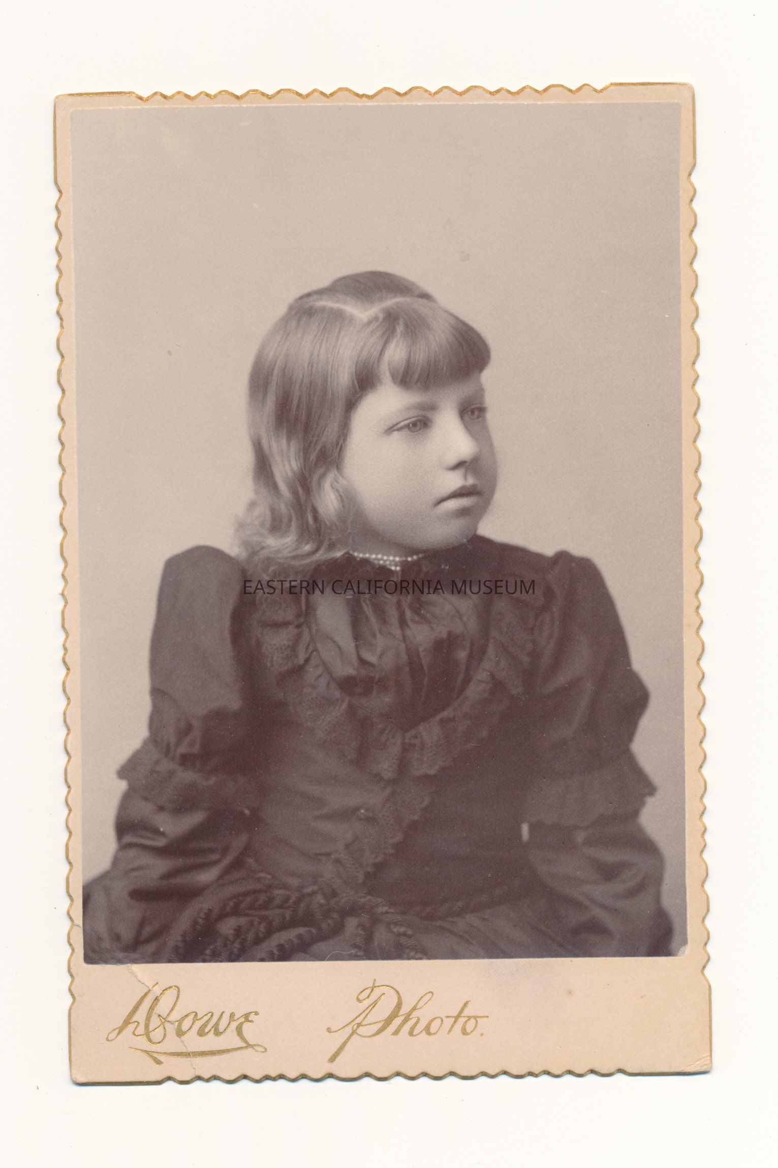 Mounted studio portrait of Nettle Irwin as a young girl. The photographer was Dowe. Nettie Irwin was the daughter of Lucretia "Lou" Joslin Irwin and John C. Irwin.Collection