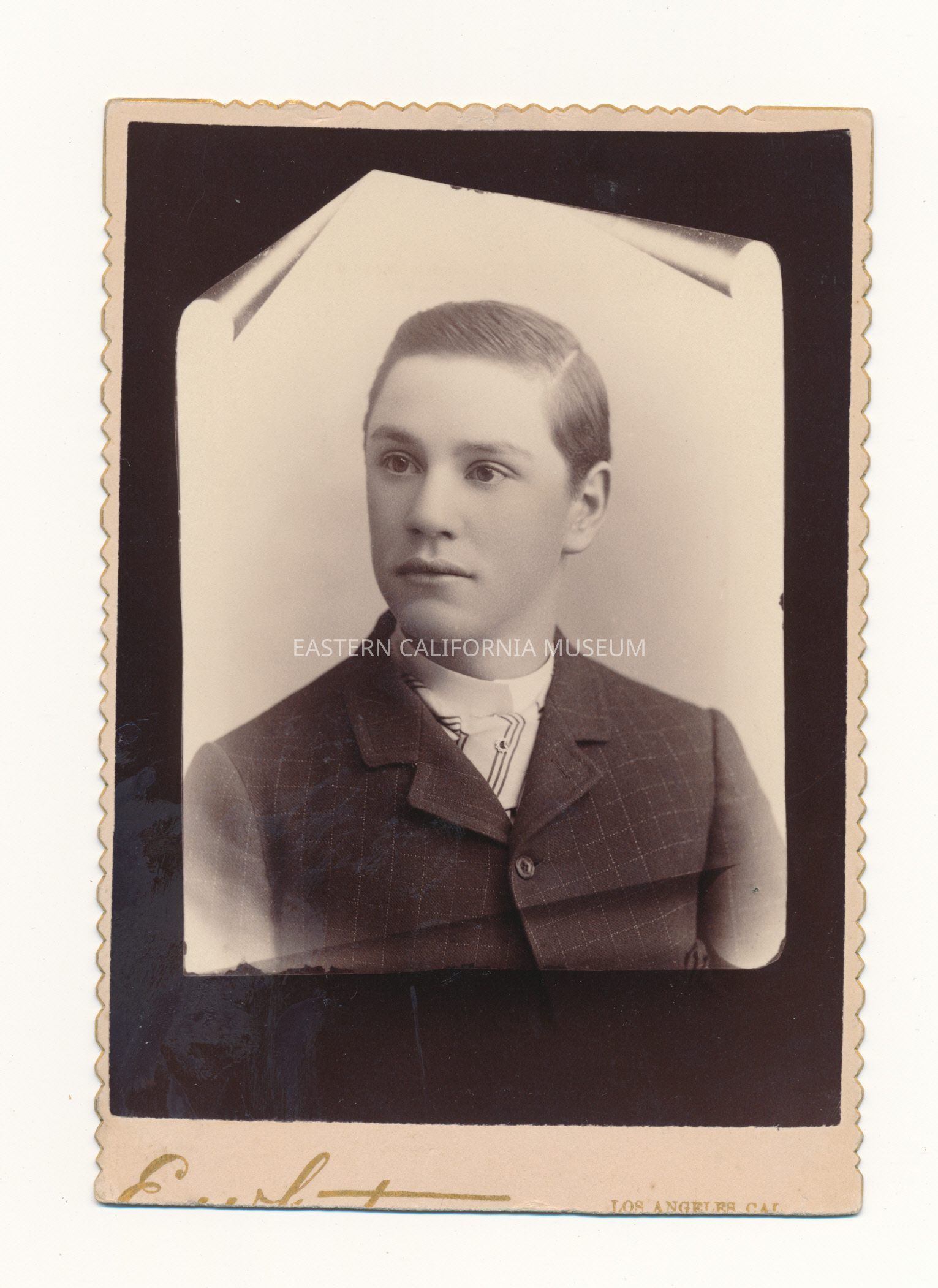 Mounted bust length studio portrait of Norman Mairs, the son of O. I. Mairs. The effect of the photo is that his image is on a scroll. The mount was longer, but the bottom edge was trimmed and now obscures the photographer or studio's identity (began with "E"). Photographer was based in Los Angeles, Cal.Collection
