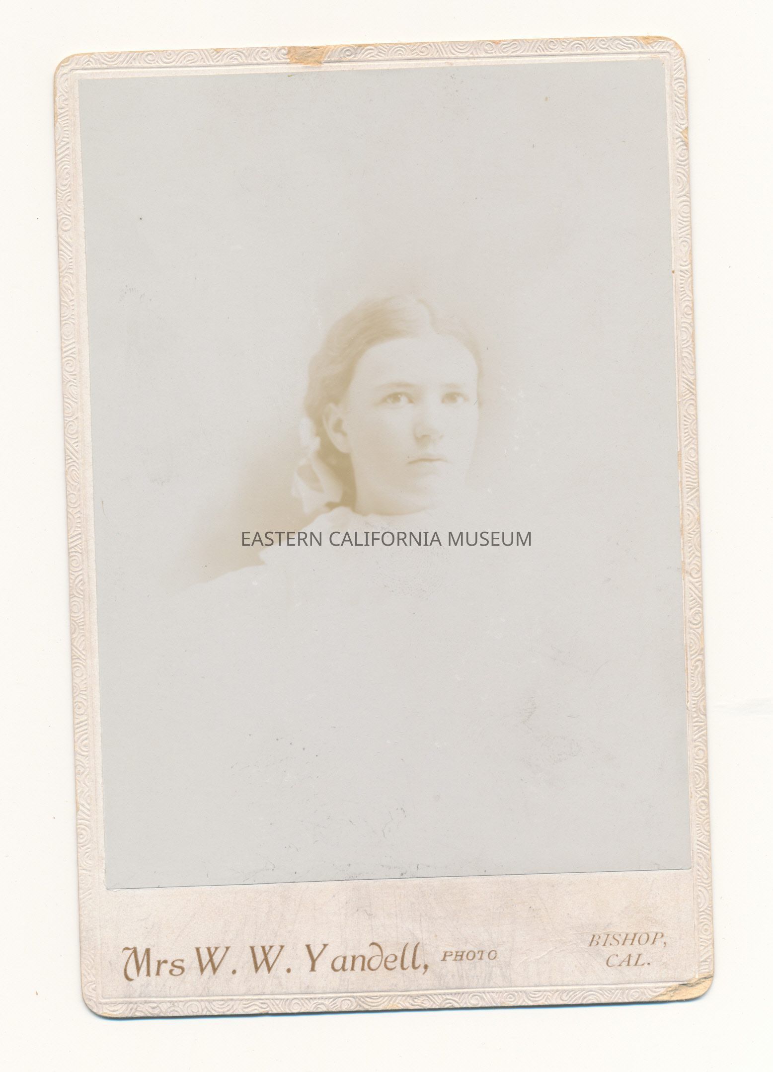 Faded mounted studio portrait of Maggie Bunney as a young girl. Photographer was Mrs. W. W. Yandell of Bishop, CA.Collection