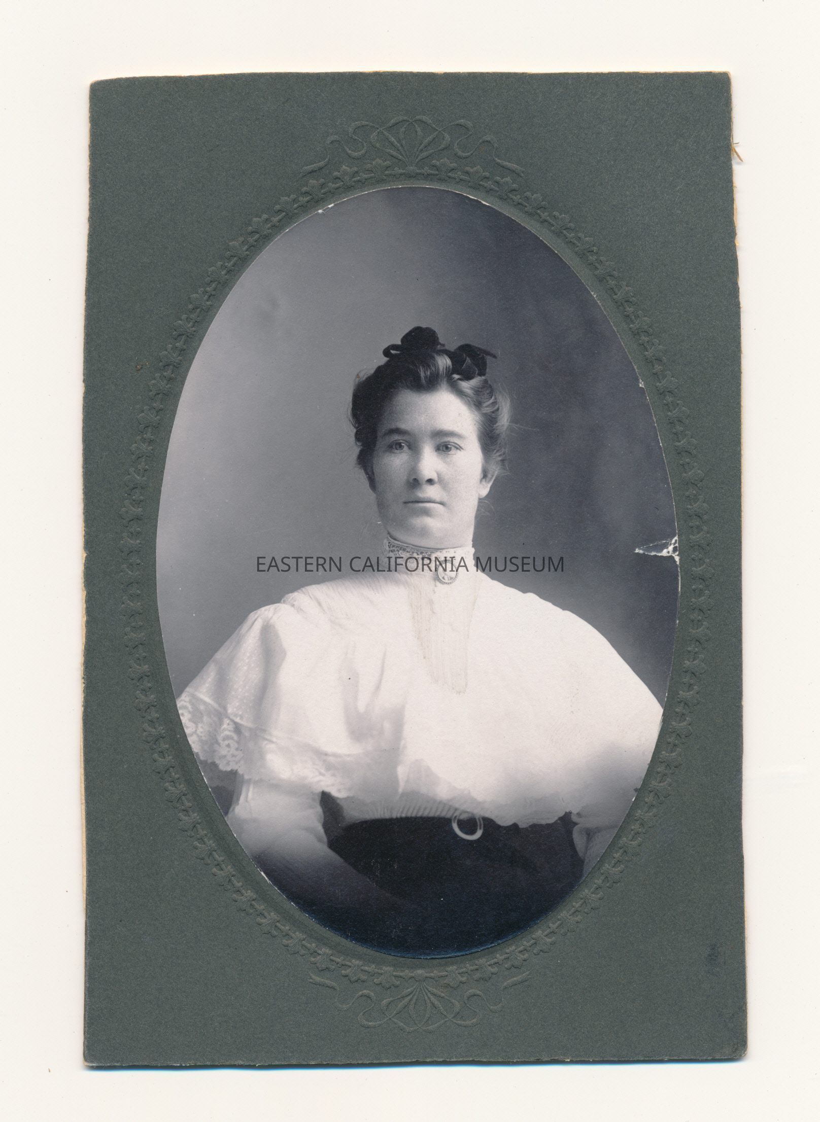Mounted studio portrait of Amy Lawrence Gibson. She was the daughter of Mr. and Mrs. Frank Lawrence.