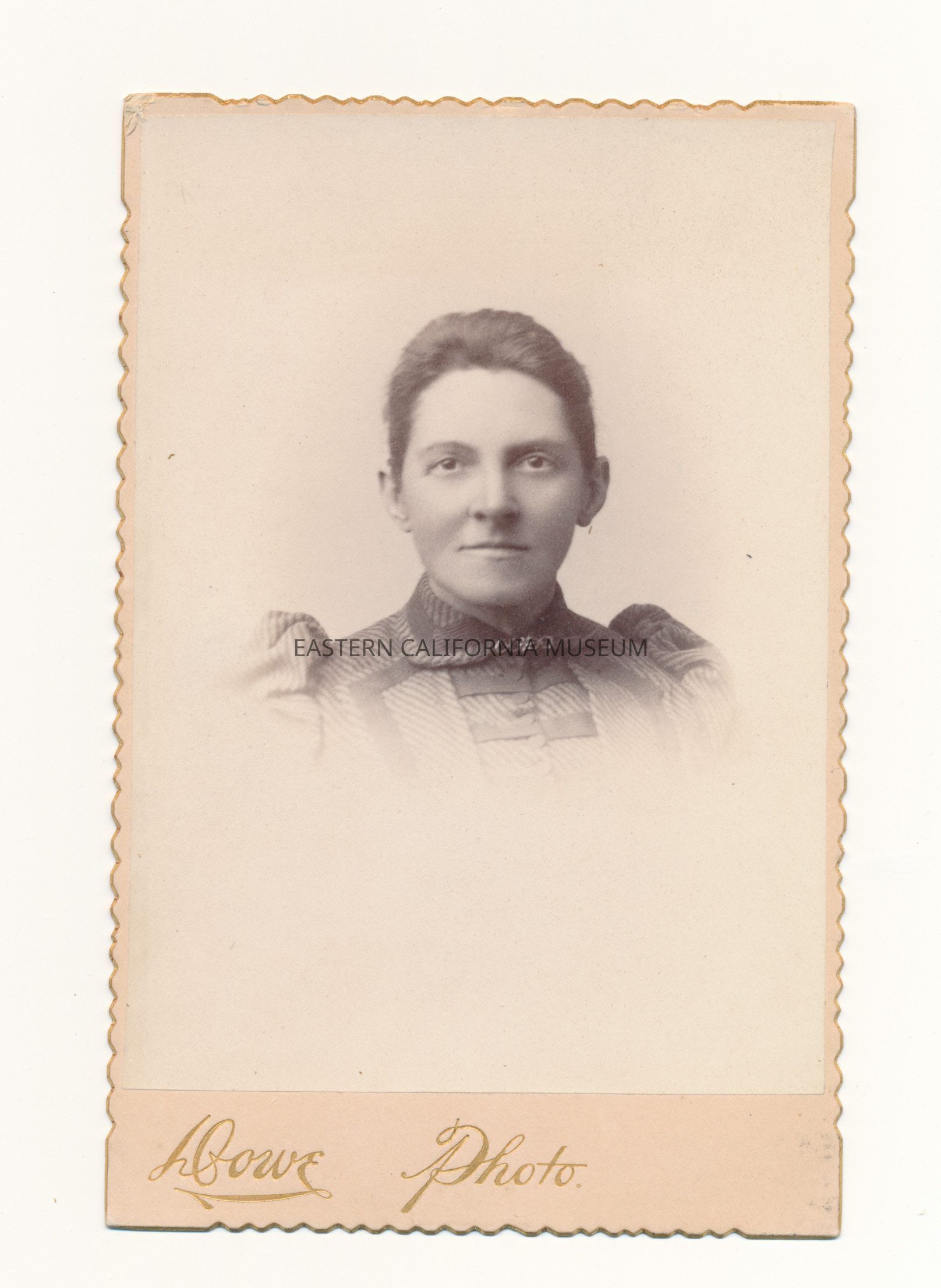 Mounted studio portrait of Louise Woodin, wife of Dr. Irving J. Woodin. The photographer was Dowe.