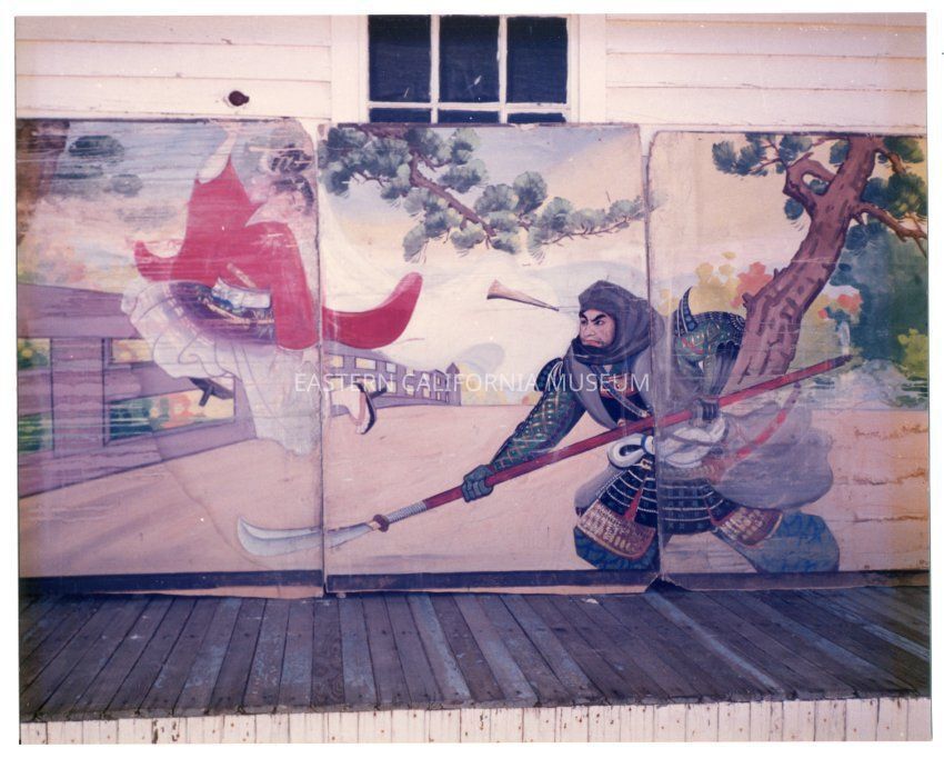 Mural painting on the plasterboards that lined the barrack apartments in the Manzanar Camp. Was collected by Jerome Thornton of Oak Creek, north of Independence. The artwork was in his possession for 40 years and was thoughtfully presented to the Manzanar Project at the Eastern California Museum in Independence, CA.Photograph Details
