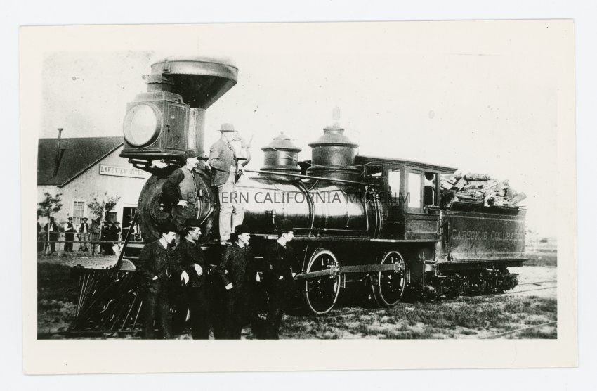 Photo postcard of a Carson and Colorado engine #6, "The Hawthorne," stopped in front of the Lakeview Hotel in Keeler in 1885. Six men standing on or in front of the train, while several more people are in the background near the hotel. Same image as A1107.21.Collection