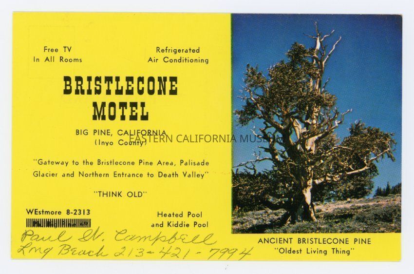 Color photo postcard of a bristlecone pine tree with a bright yellow advertisement for the Bristlecone Motel in Big Pine. Someone has written on the front: Paul Campbell, Long Beach [and a phone number].