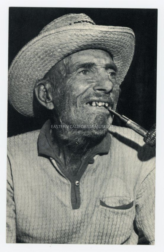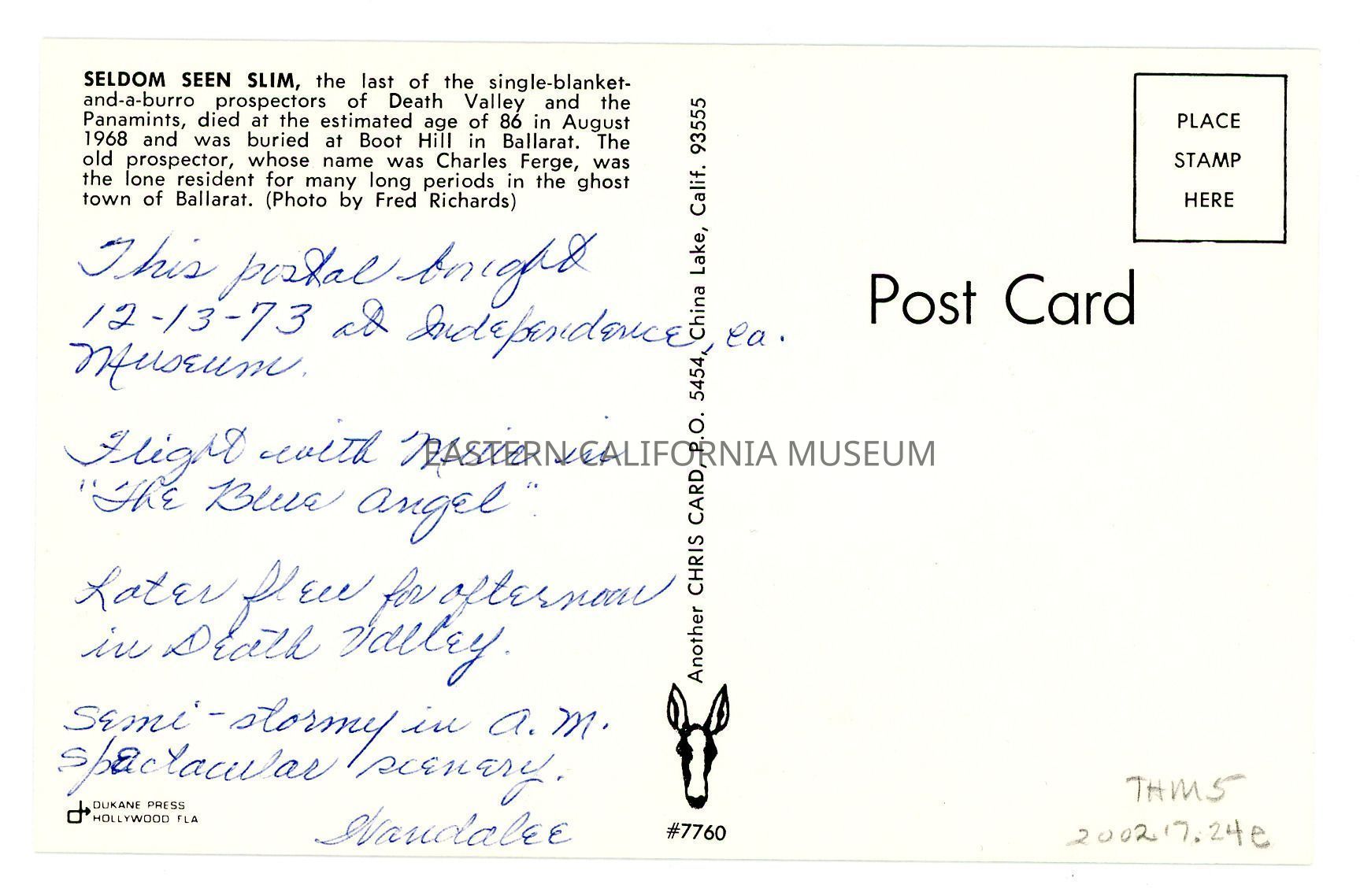 On reverse: Seldom Seen Slim, the last of the single-blanket-and-a-burro prospectors of Death Valley and the Panamints, died at the estimated age of 86 in August 1968 and was bured at Boot Hill in Ballarat. The old prospector, whose name was Charles Ferge, was the lone resident for many long periods in the ghost town of Ballarat. (Photo by Fred Richards)