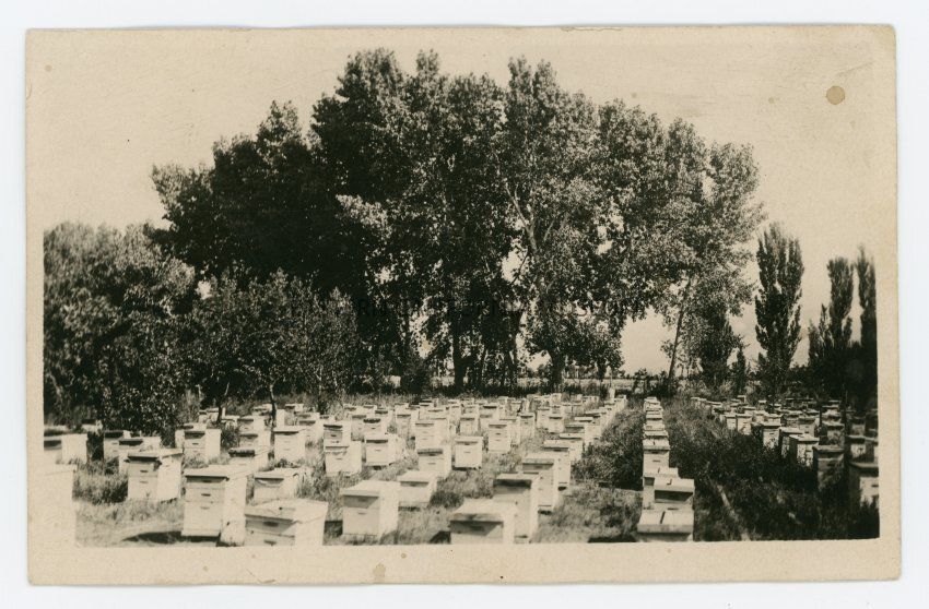 Photo postcard of rows of beehives at an apiary. Written in pencil on reverse: E2985. 26 cms wide, base mounted, 100 line zinc halftone. Return photo W. A. Chalfant, Bishop, Cal.