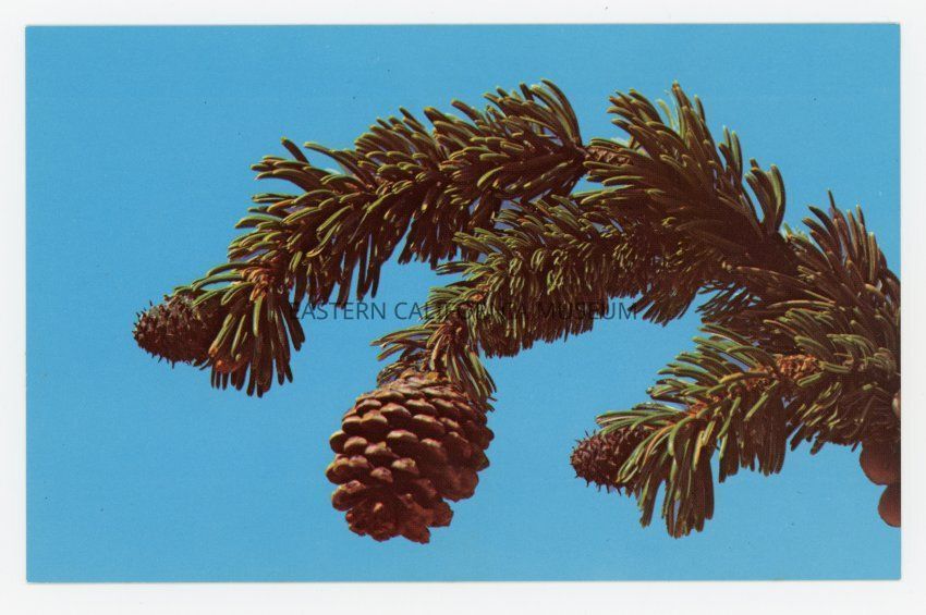 On reverse: Ancient Bristlecone Pine--Pinus Aristata. These long lived historians are named for the bristles on the first year small purple cone. These delicate masterpieces of nature evolve into the almost ordinary looking cone in the center and at the end of 2 years reseed this remarkable Bristlecone Pine Tree. Color photo by Louis and Virginia Kay.
