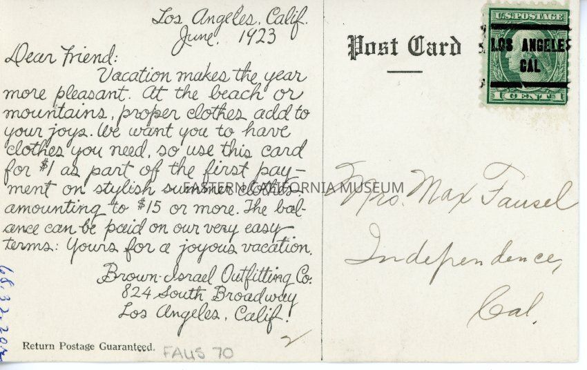 Photo postcard advertisement from Brown-Israel Outfitting Co. of Los Angeles to Mrs. Max Fausel of Independence, CA.