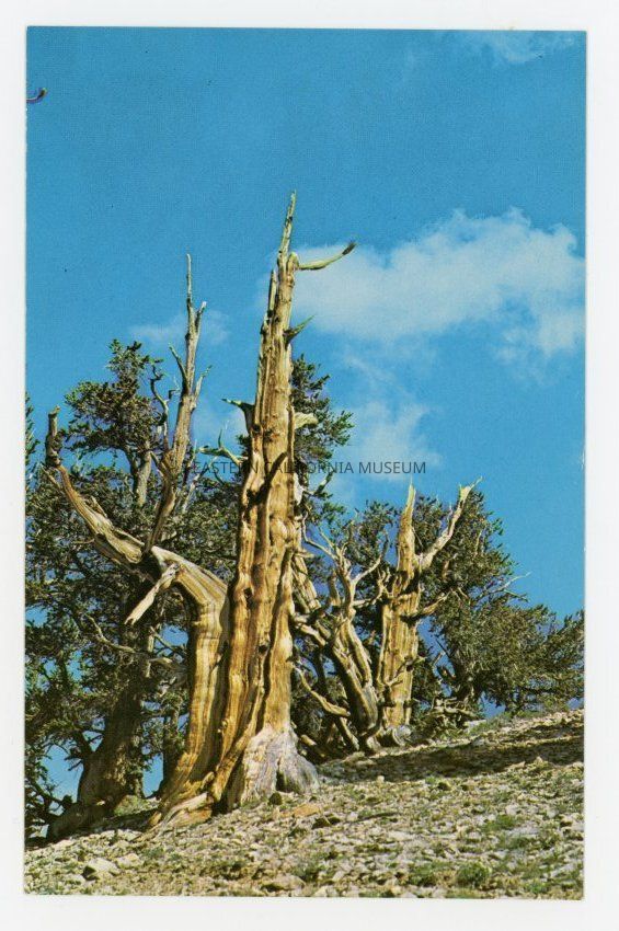 Color photo postcard of ancient bristlecone pine trees in the White Mountains.