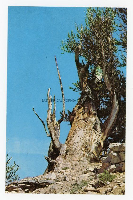 Color photo postcard of ancient bristlecone pine trees in the White Mountains.