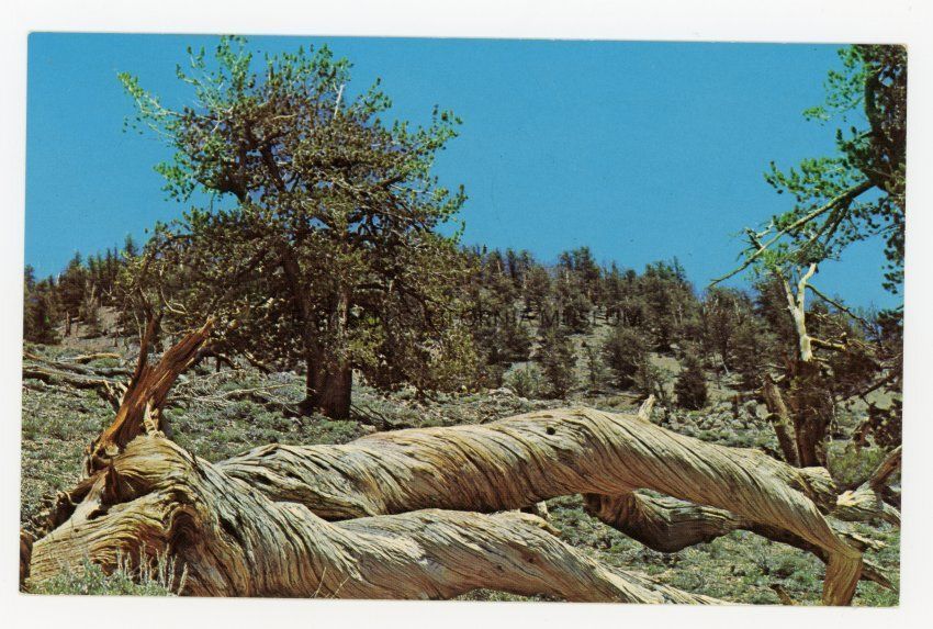 Color photo postcard of ancient bristlecone pine trees in the White Mountains.