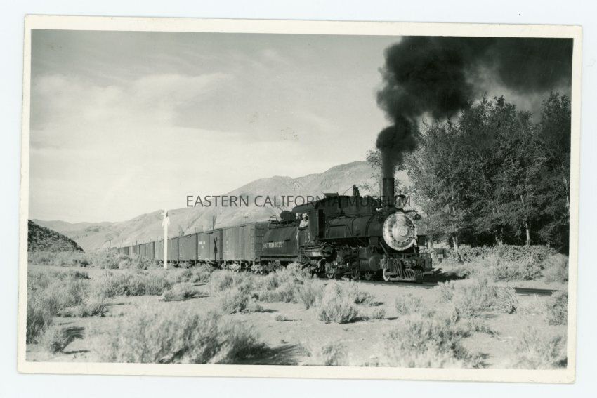 Photo postcard of Southern Pacific engine #18 hauling a long line of boxcars. A man (engineer?) is leaning out the cab window. There is sagebrush all around, some tress to the right, possibly a building (station or depot?) behind the train, a railroad crossing sign, and low mountains in the background. Black smoke is coming out of the smokestack.