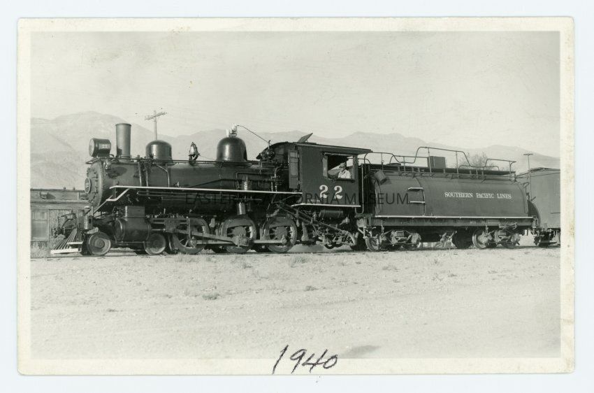 Photo postcard of Southern Pacific engine #22. There is a man sitting in the cab (engineer?) and a building is partially visible behind the engine. "1940" is written beneath the picture.