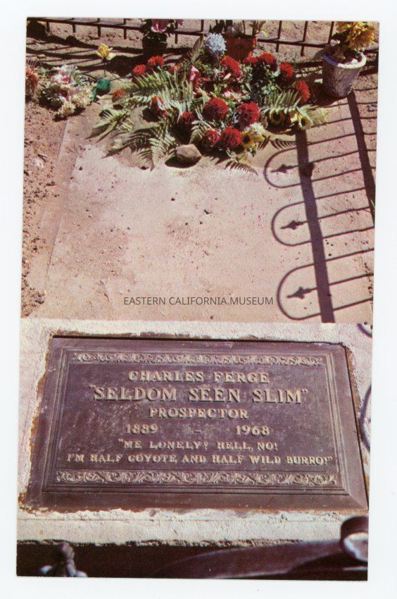 Color photo postcard of the gravesite of Charles Ferge, prospector, 1889-1968, better known as Seldom Seen Slim. His grave marker includes his names as well as the quote: "Me, lonely? Hell, no! I'm half coyote and half wild burro!"