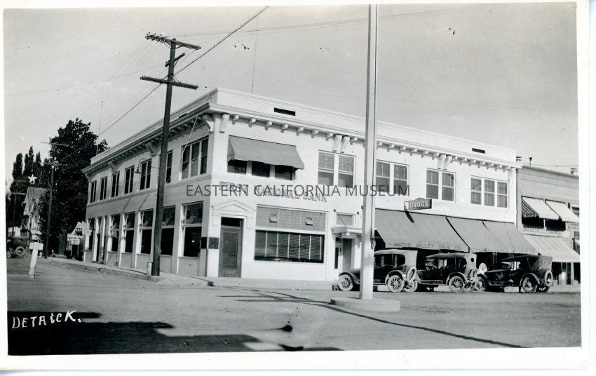 Photo postcard by Detrick of First National Bank, Owens Valley Drug Co., and Owens Valley Bank in Bishop, CA. Location is on the corner of Main St. and Line St. Photographer was Detrick of Bishop.Photograph Details