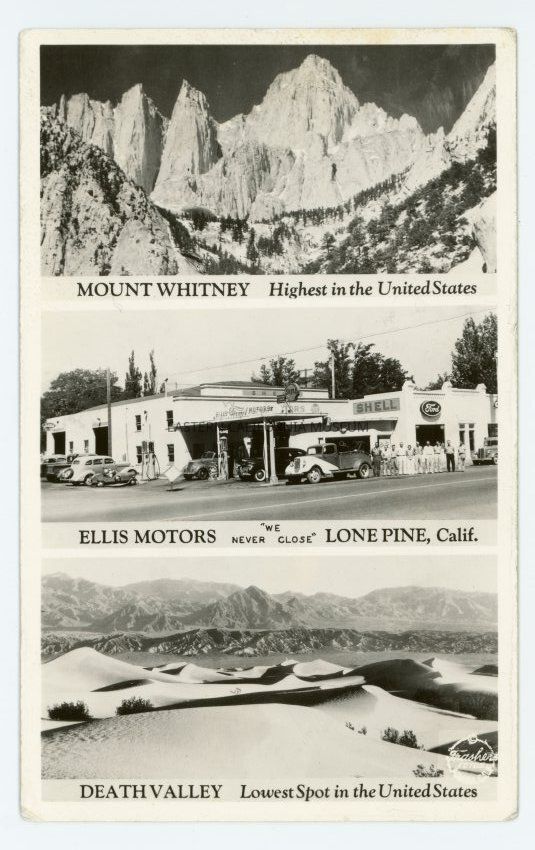 Photo postcard with three different images: top is of Mount Whitney; middle is of Ellis Motors garage and gas station in Lone Pine; and bottom is of Death Valley. Photographer was Burton Frasher.