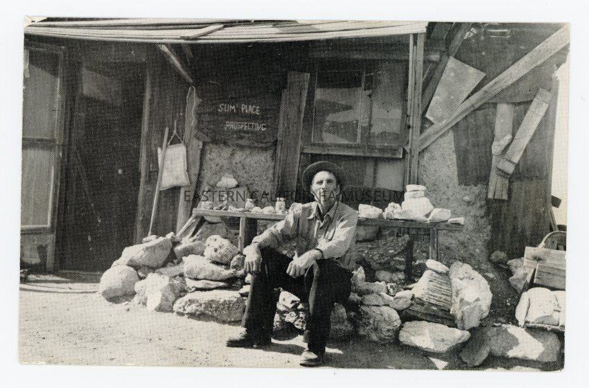 Photo postcard of Charles Ferge, better known as Seldom Seen Slim, sitting outside his cabin or shack in Ballarat. Sign by the door says, "Slim's Place, Prospecting." Photo by Graham Westmorland of Desert Photo Services.