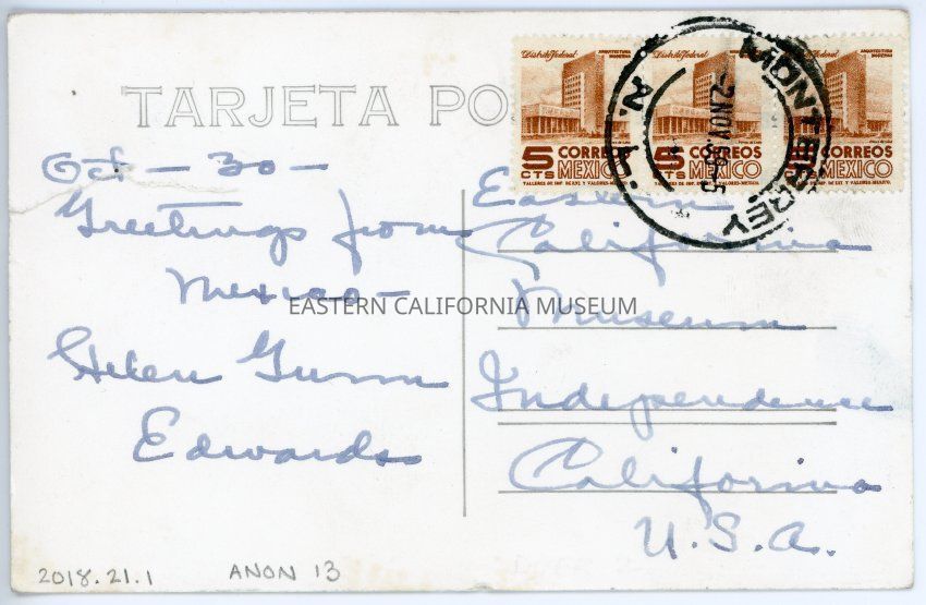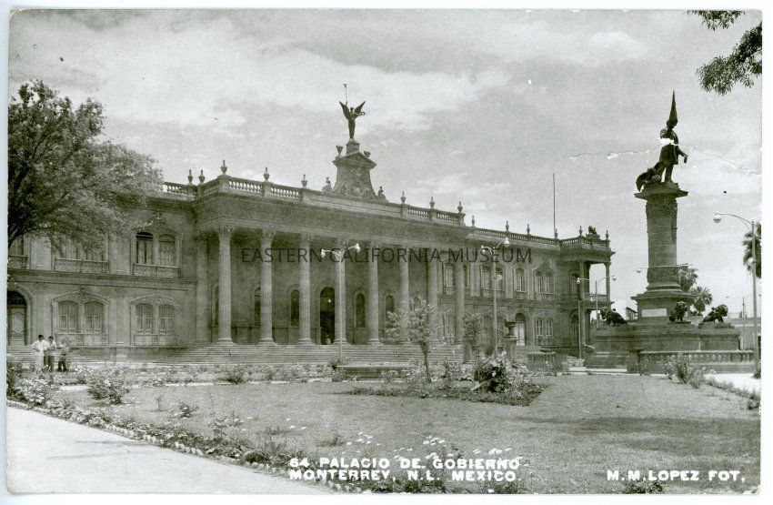 Black and white photo postcard titled, "64 Palacio de Gobierno, Monterrey, N. L. Mexico." Photographer is M. M. Lopez. Shows what appears to be a large government building with a statue in front of it. Sent from Helen Gunn Edwards to the Eastern California Museum. Has three brown five cent stamps. Small tear on right side.Made/Created