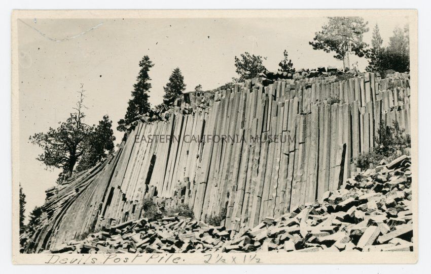 Photo postcard of Devils Postpile in Mono County. Written beneath the image is, "Devils Post Pile. 2 1/2 x 1 1/2."