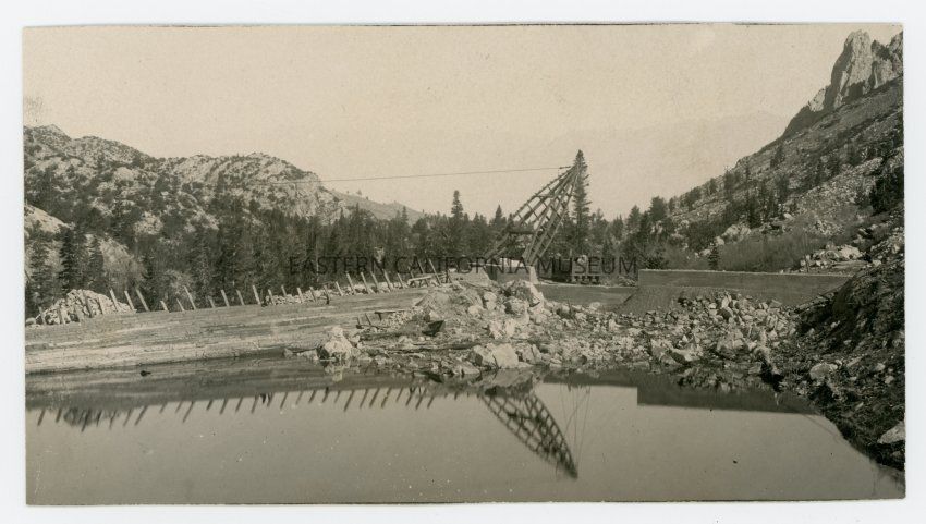 Cut-down photo postcard of dam construction on a mountain lake (maybe Lake Sabrina?). Written in blue ink on reverse: Scott.