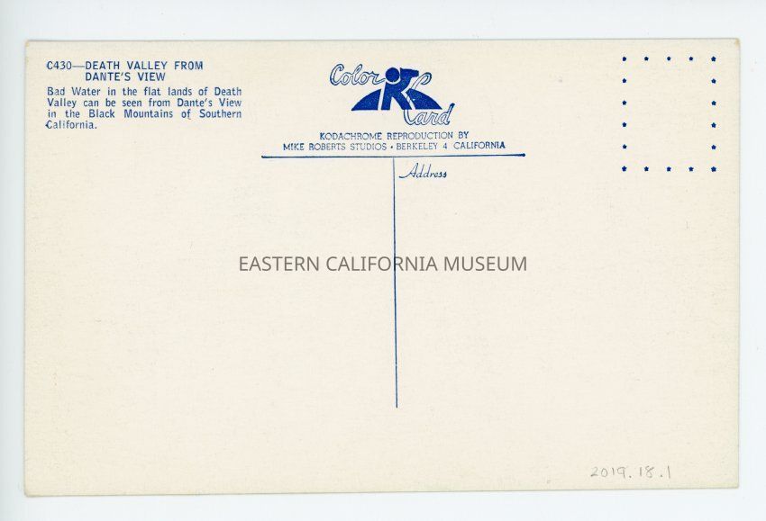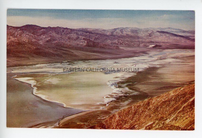 Color photo postcard of Death Valley from Dante's View (C430). "Bad Water in the flat lands of Death Valley can be seen from Dante's View in the Black Mountains of Southern California." Kodachrome reproduction by Mike Roberts Studios in Berkley.Collection