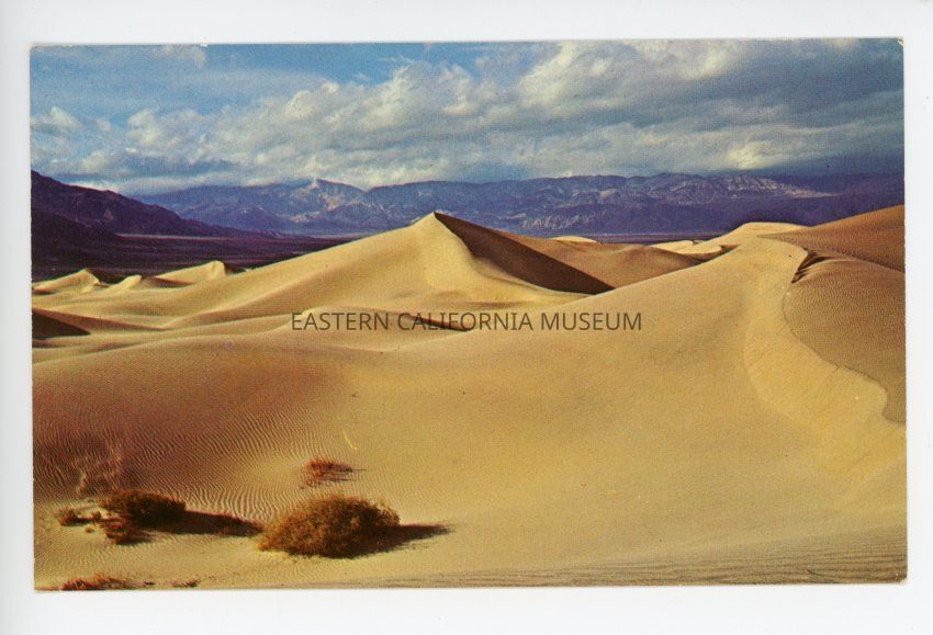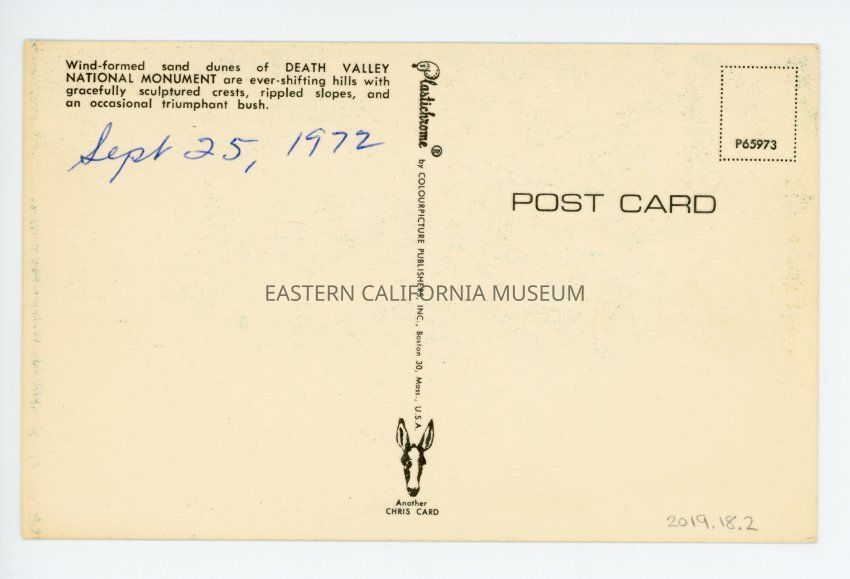 Color photo postcard of sand dunes in Death Valley. "Wind-formed sand dunes of Death Valley National Monument are ever-shifting hills with gracefully sculptured crests, rippled slopes, and an occasional triumphant bush." P65973. Plastichrome by Colourpicture Publishers, Inc. of Boston. "Another Chris Card." Date on written in blue ink on back is Sept. 25, 1972.Collection