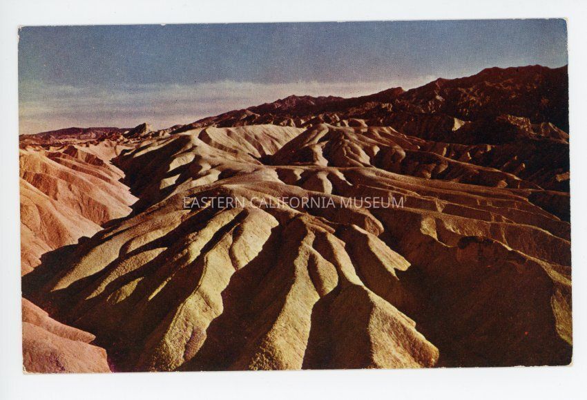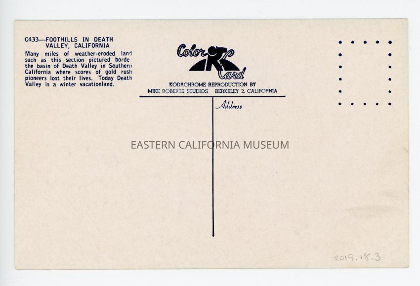 Foothills in Death Valley, California (C433). "Many miles of weather-eroded land such as this section pictured border the basin of Death Valley in Southern California where scores of gold rush pioneers lost their lives. Today Death Valley is a winter vacationland." Kodachrome reproduction by Mike Roberts Studios in Berkley.Collection