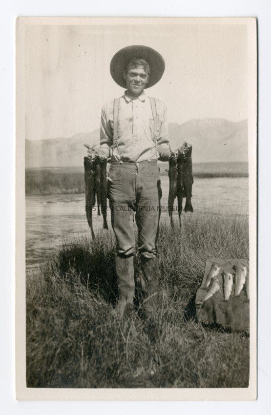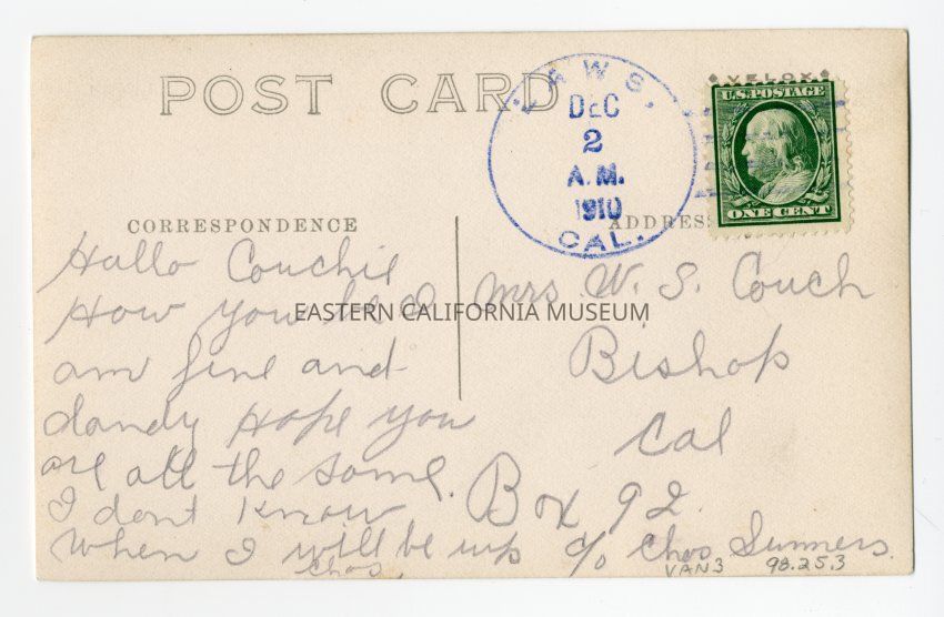 Photo postcard with a photo of a man holding up six large trout, with several more laid out on a rock beside him. River and mountains visible in background. The postcard is addressed to Mrs. W. S. Couch of Bishop from Chas. Summers. It has a green one cent Benjamin Franklin stamp and is postmarked Laws, December 2, 1910.Collection