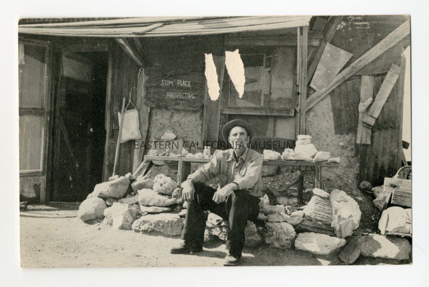 Photo postcard of Seldom Seen Slim (Charles Ferge) sitting in front of his cabin in Ballarat. A sign behind him says "Slim's Place Prospecting."