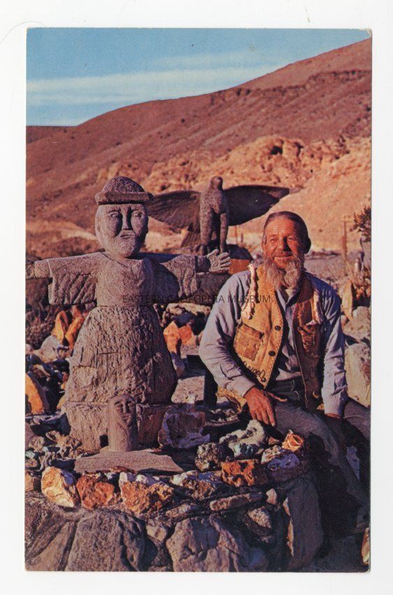 Color postcard showing a man sitting next to a carved stone or wood human sculpture. Description on reverse says, "Driftwood Charlie Kasling with his unique art chiseled out of stone and wood has become one of the legendary figures of the desert area near Death Valley. His creations range from weird renditions of ancient prehistoric animals to birds, monsters, and old desert prospectors." P58192. Plastichorme by Colourpicture Publishers, Inc. of Boston. Chris Cards of China Lake.