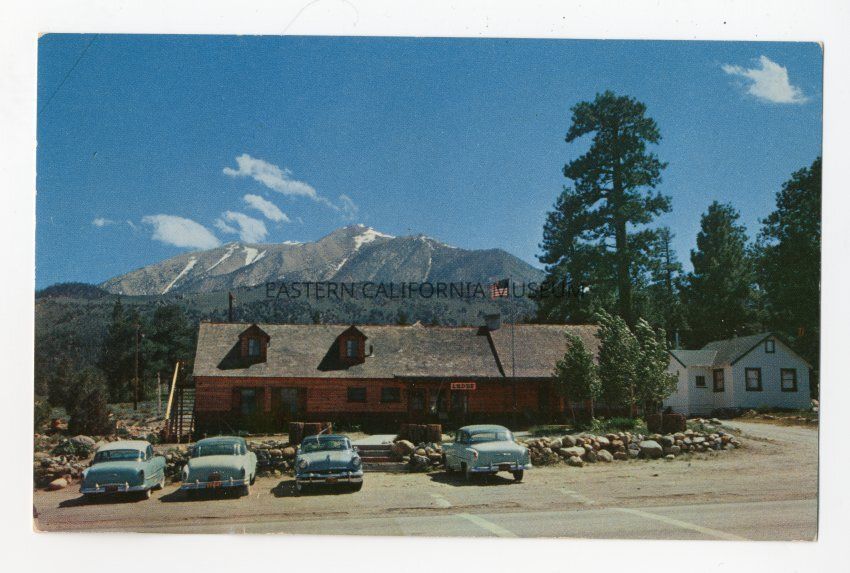 Color postcard showing a log building (Tom's Place) with four cars parked in front. There is a flag flying and smaller, white building to the right. H-159. Published and distibuted by Columbia.Collection