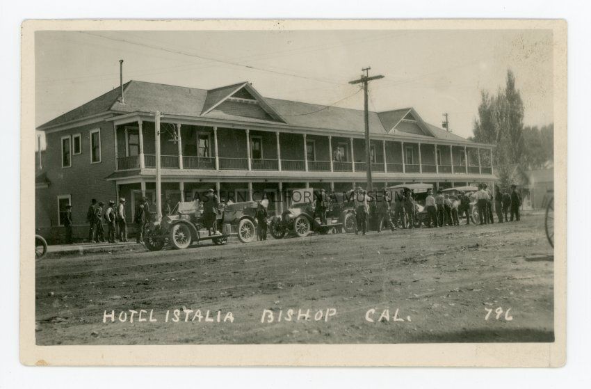 Photo postcard of the Hotel Istalia in Bishop. It has ID #796. There is a row of vehicles parked in front of it, and many people standing outside.Collection