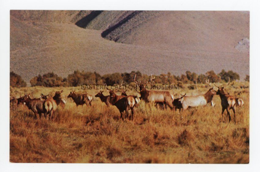 Color photo postcard of a herd of tule elk in the Owens Valley. Descriptive text on reverse: Tule elk, among the world's rarest mammals, in the scenic Owens Valley, California, at the foot of the High Sierras on U.S. Highway 6 and 395. You can help save this beautiful animal from extinction by writing to Committee for the Preservation of the Tule Elk.Collection