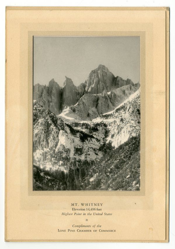 Mounted black and white photo of Mt. Whitney. Printed on the matting is: "Mt. Whitney, Elevation 14,496 feet, Highest Point in the United States. Compliments of the Lone Pine Chamber of Commerce."Collection
