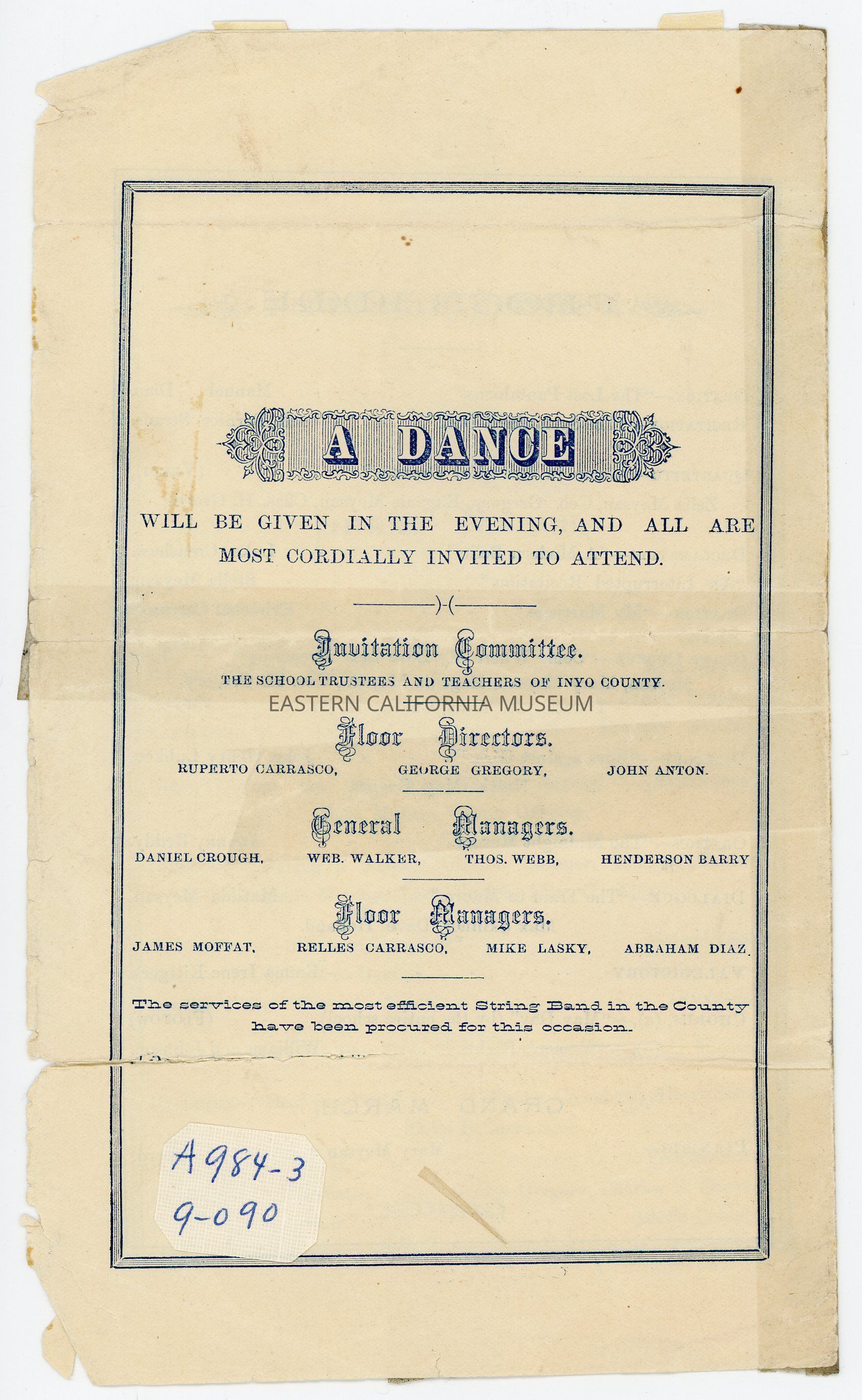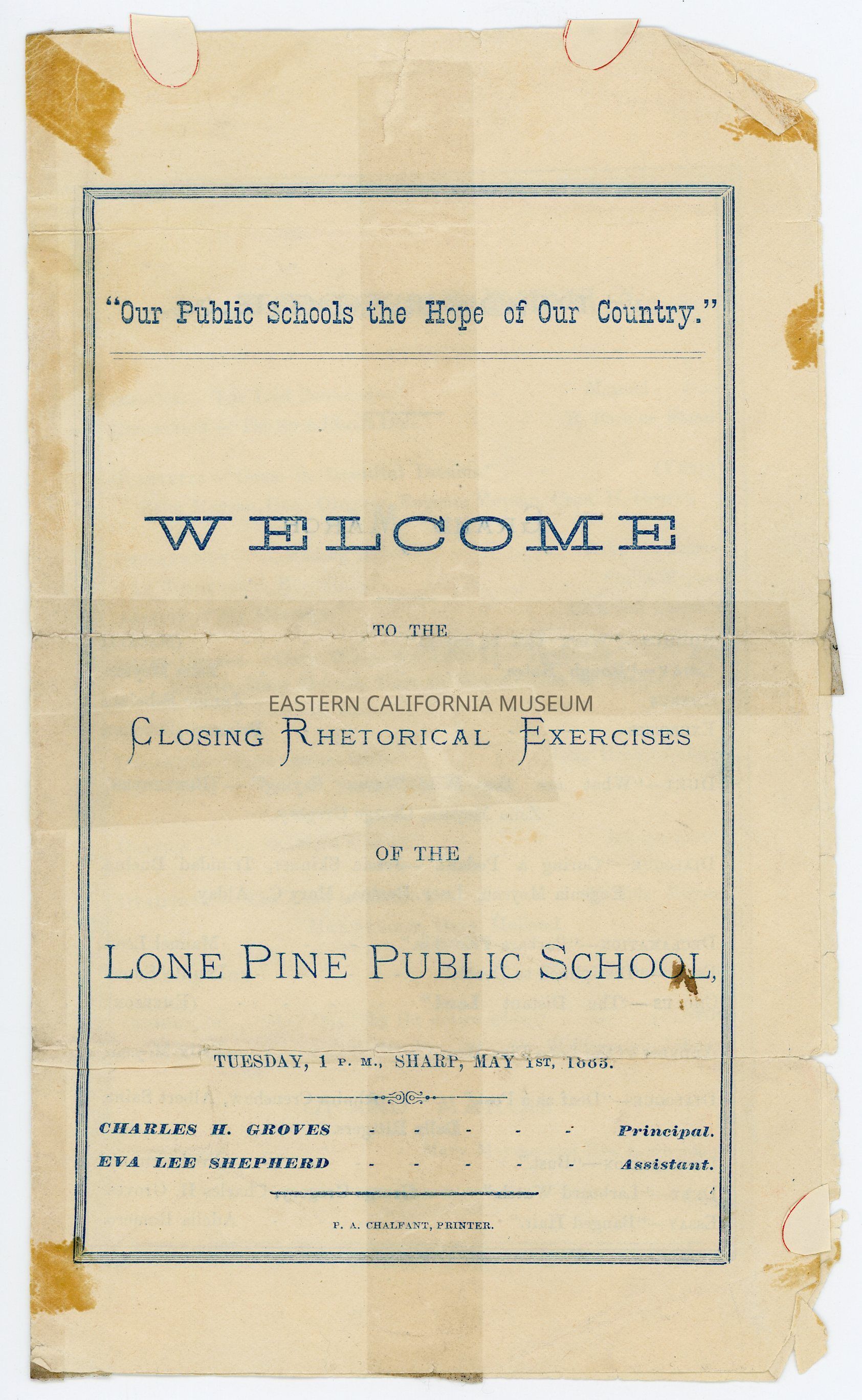Program for the Closing Rhetorical Exercises of the Lone Pine Public School on May 1, 1883. Charles H. Groves was the Principal and Eva Lee Shepherd was the Assistant.