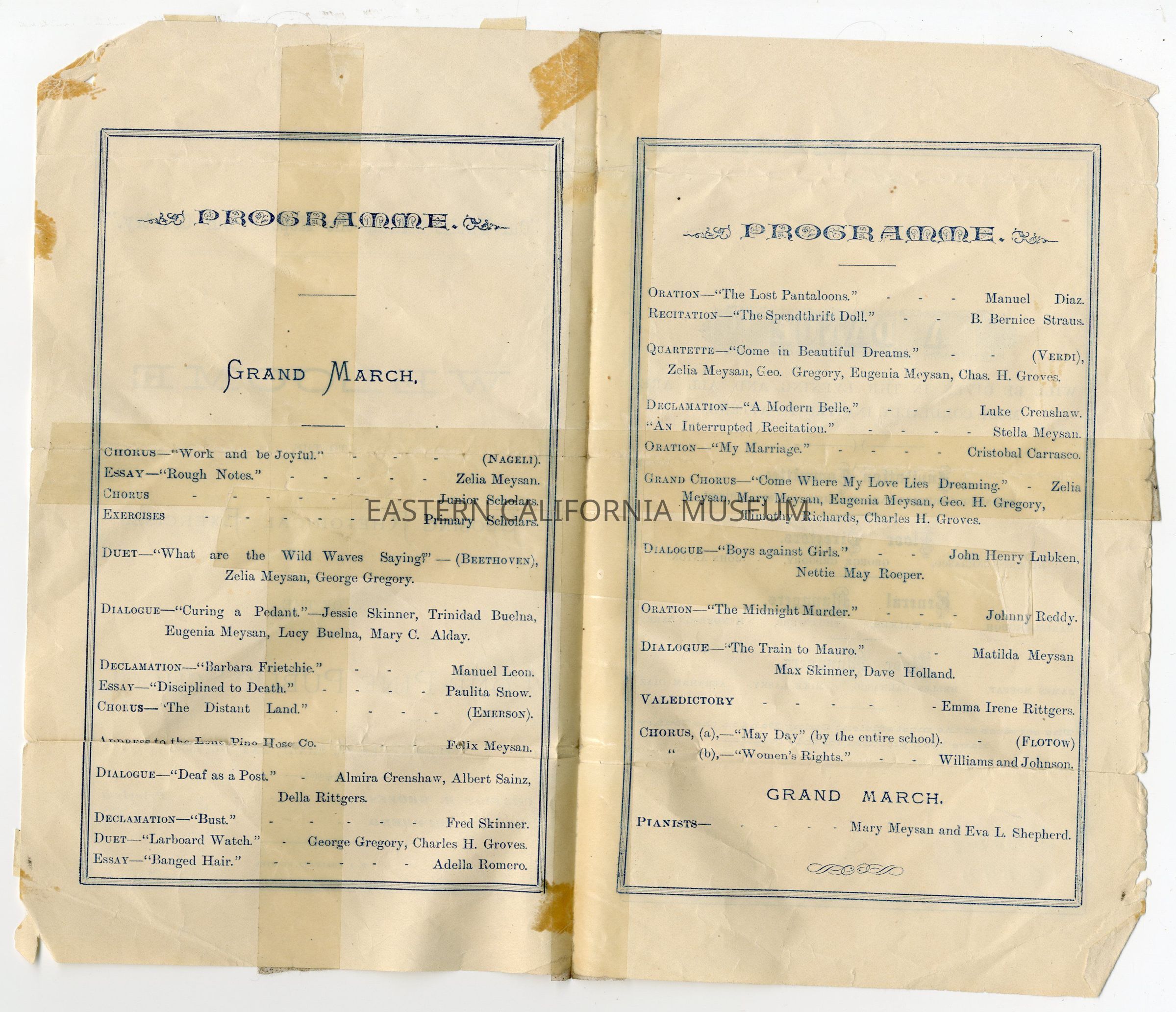 Names listed inside the program: Zelia Meysan, George Gregory, Jessie Skinner, Trinidad Buelna, Eugenia Meysan, Lucy Buelna, Mary C. Alday, Manuel Leon, Paulita Snow, Felix Meysan, Almira Crenshaw, Albert Sainz, Della Rittgers, Fred Skinner, Charles H. Groves, Adella Romero, Manuel Diaz, B. Bernice Straus, Luke Crenshaw, Stella Meysan, Cristobal Carrasco, Mary Meysan, Timothy Richards, John Henry Lubken, Nettie May Roeper, Johnny Reddy, Matilda Meysan, Max Skinner, Dave Holland, and Emma Irene Rittgers.Collection