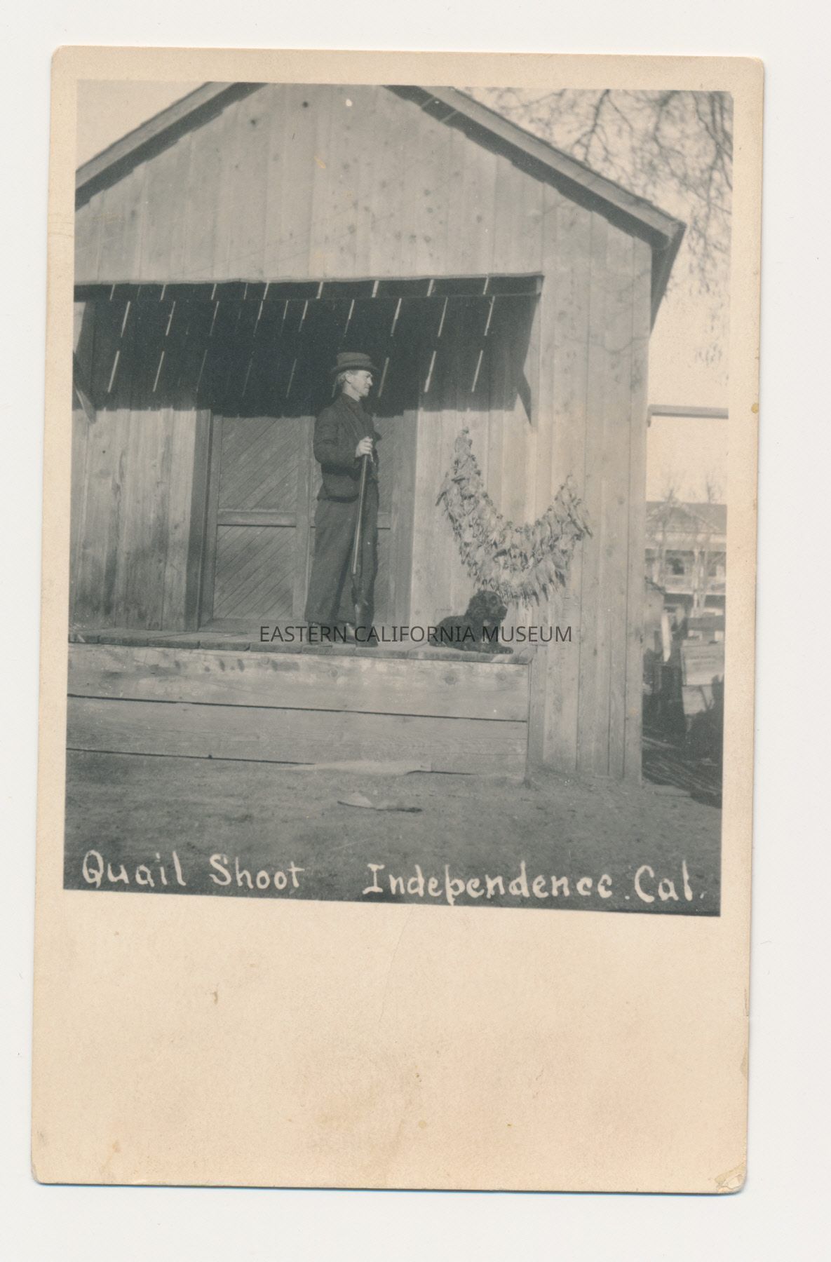 Photo postcard titled, "Quail Shoot, Independence, Cal." It shows a man holding a gun standing on the landing porch of a wooden building. There are two strings of quail hanging on the side of the building and a black dog laying near them.
