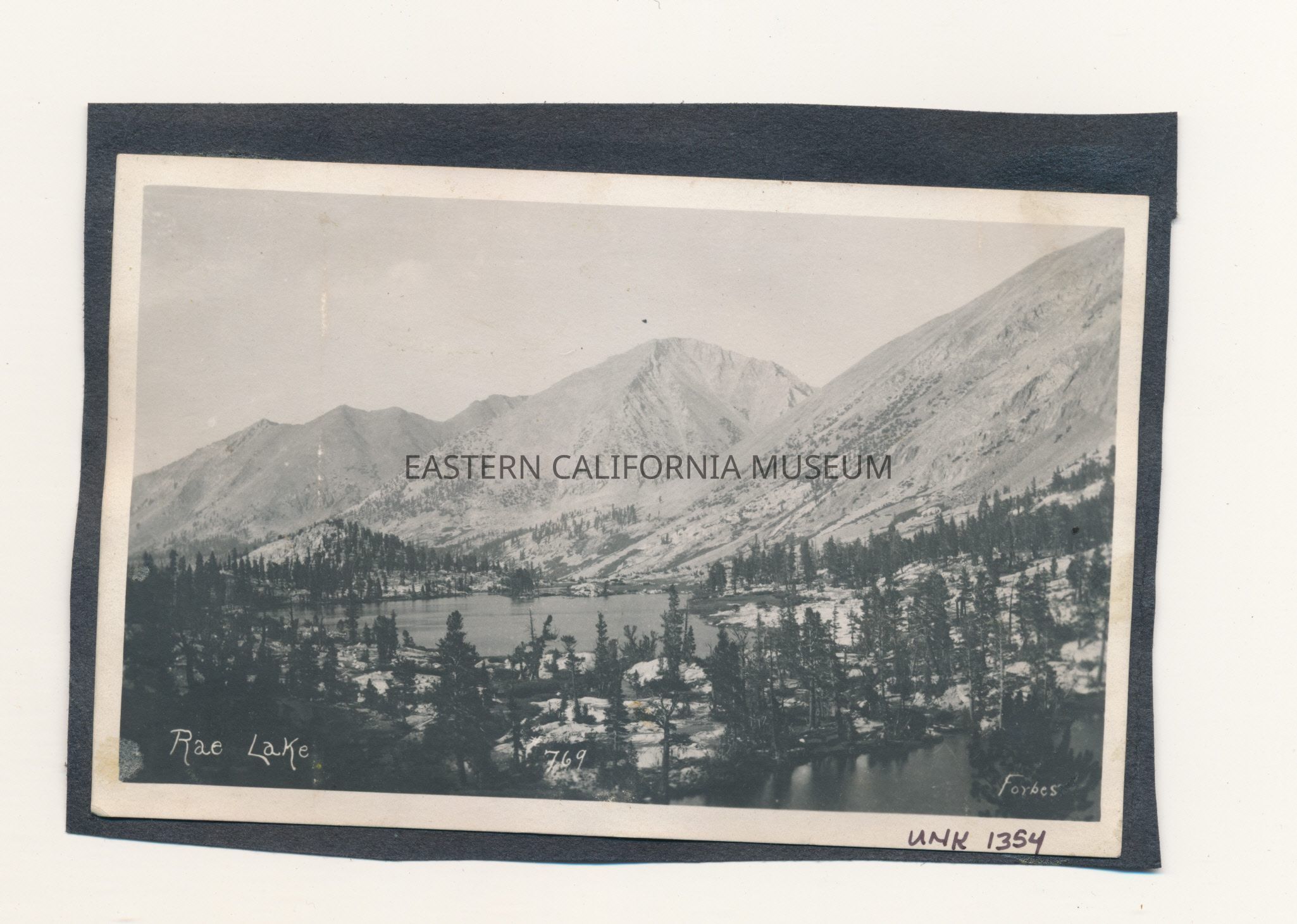 Photo of a mountain landscape titled, "Rae Lake." It was taken by photographer A. A. Forbes and given his ID #769.Made/Created