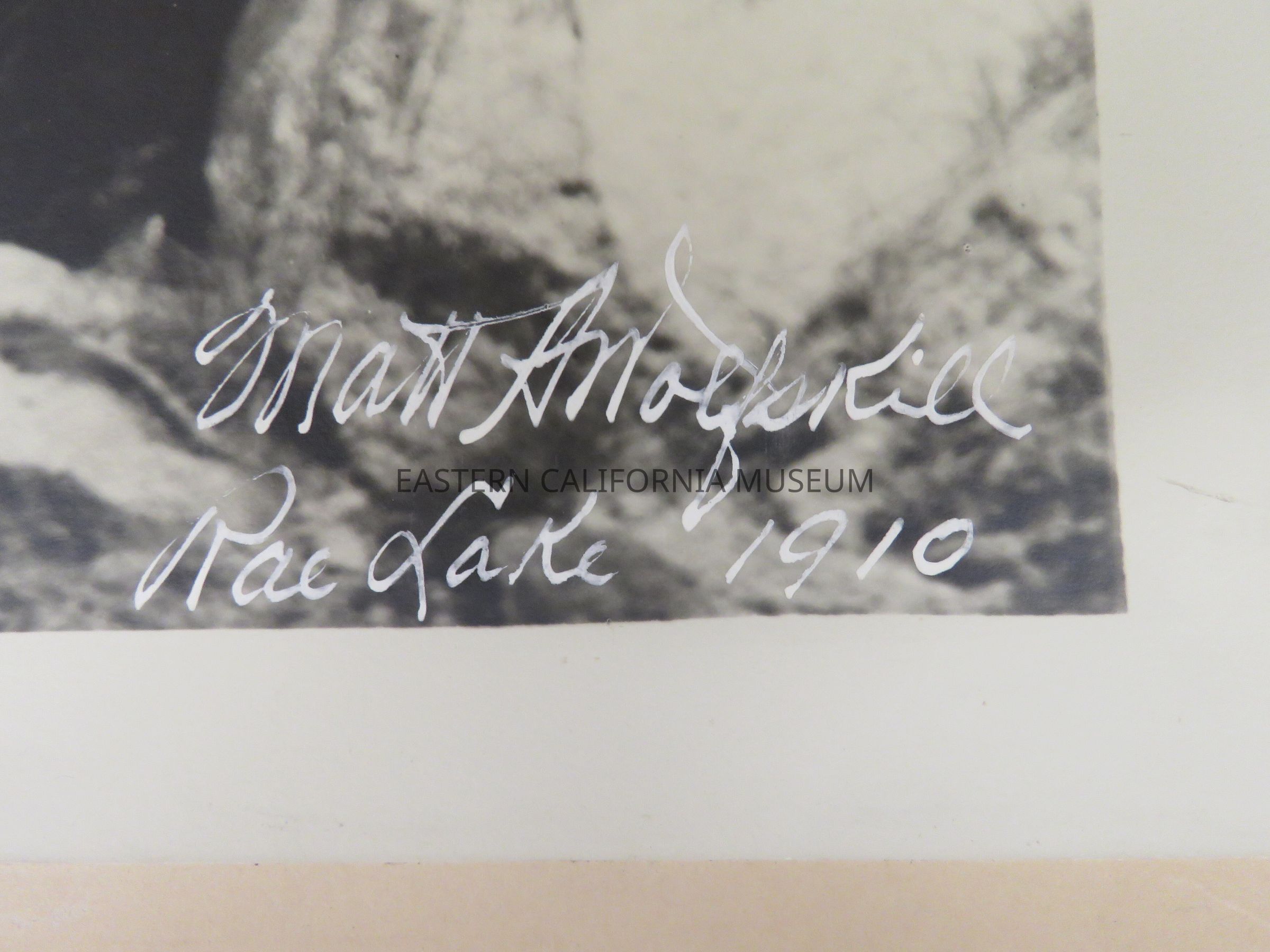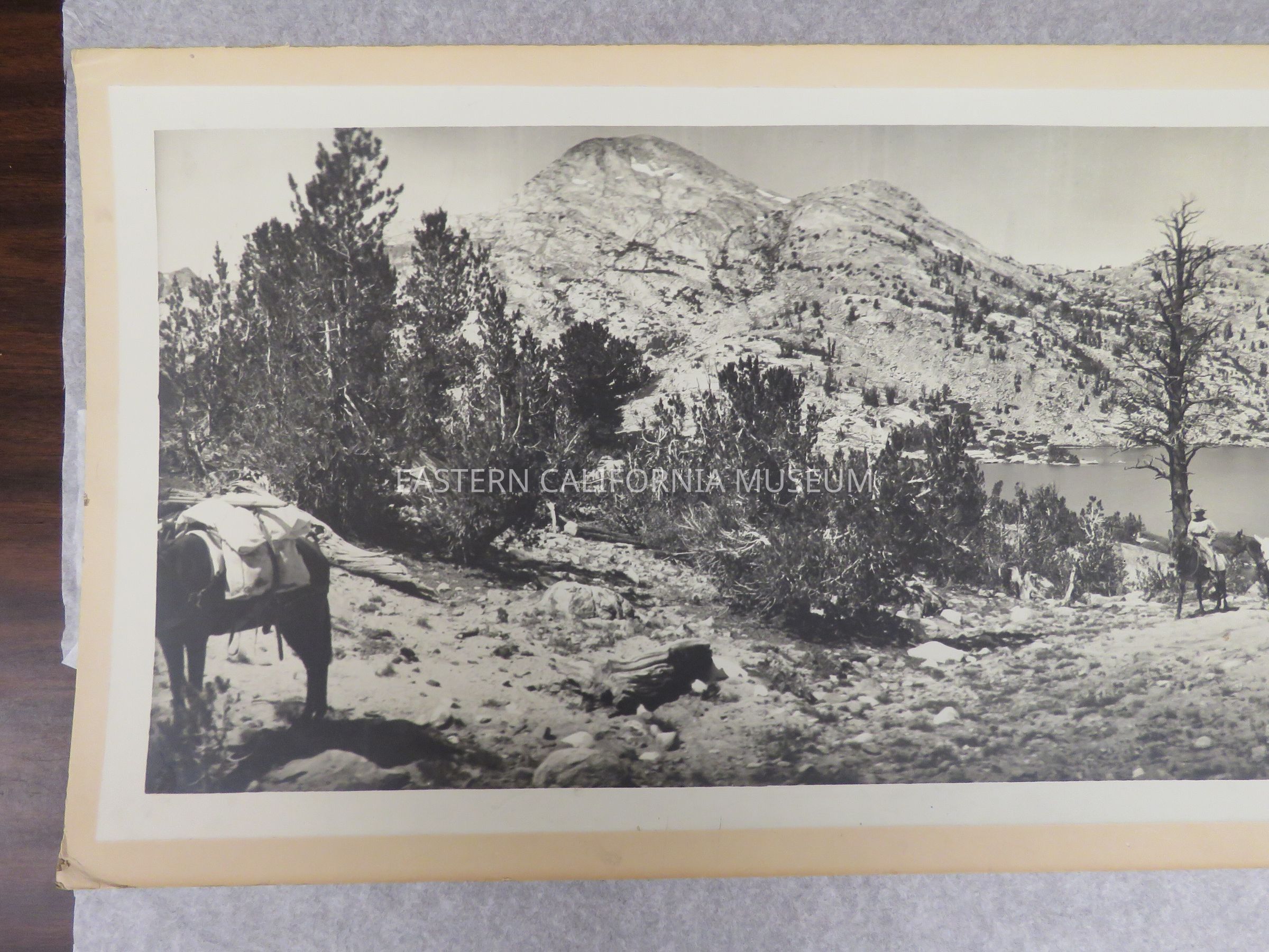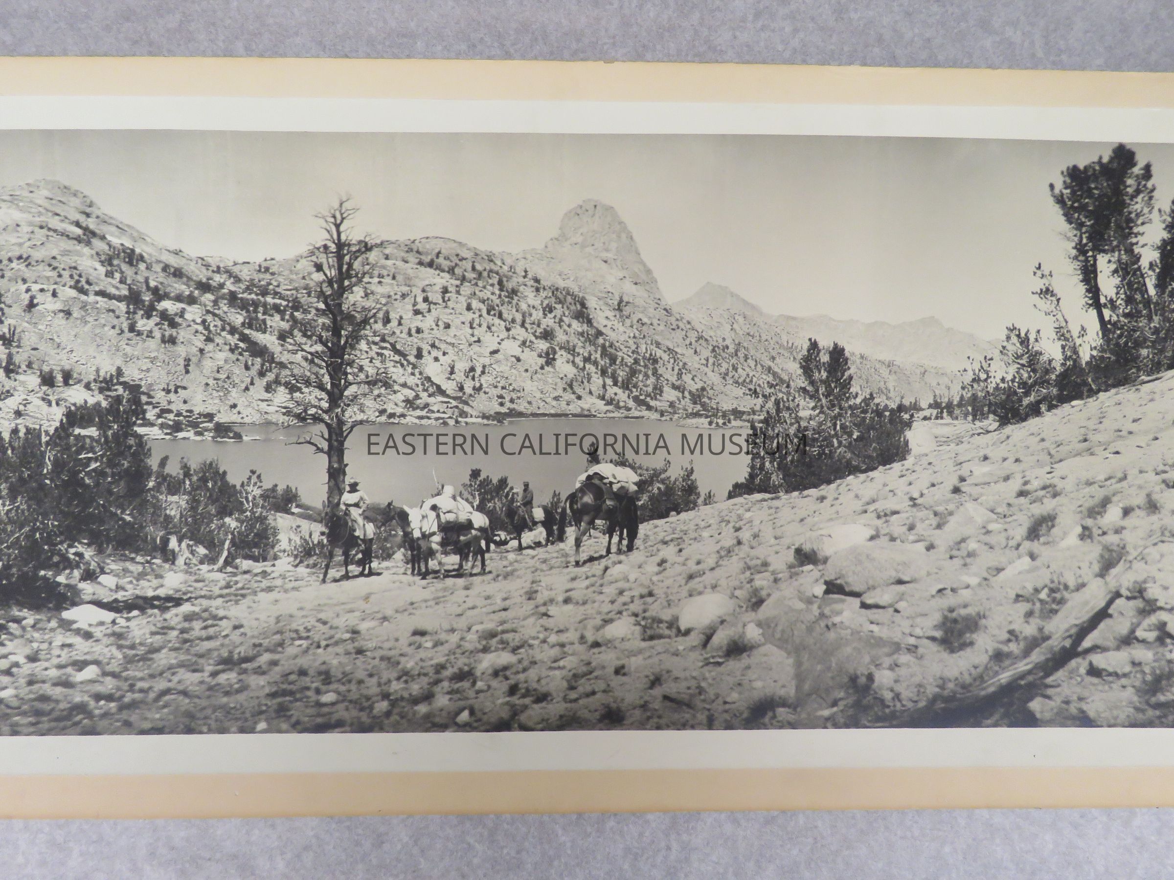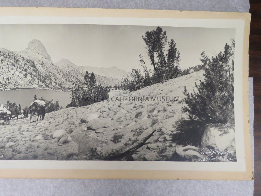 Photo of a packtrain in front of Rae Lake and Fin Dome. Signed by Matt A. Wolfskill, 1910. Same photo as 1993.45.231 and 1993.45.288.Made/Created