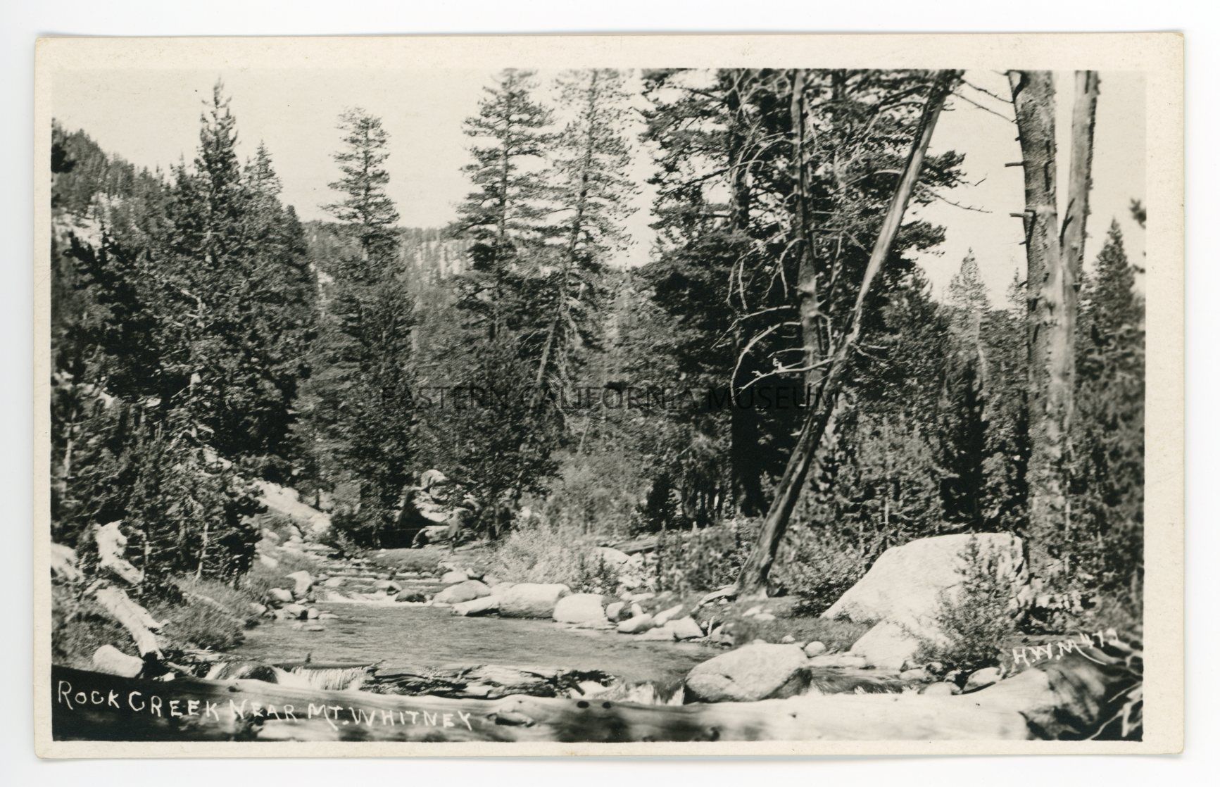 Photo postcard titled, "Rock Creek Near Mt. Whitney" taken by photographer H. W. Mendenhall and given his ID #472.Collection