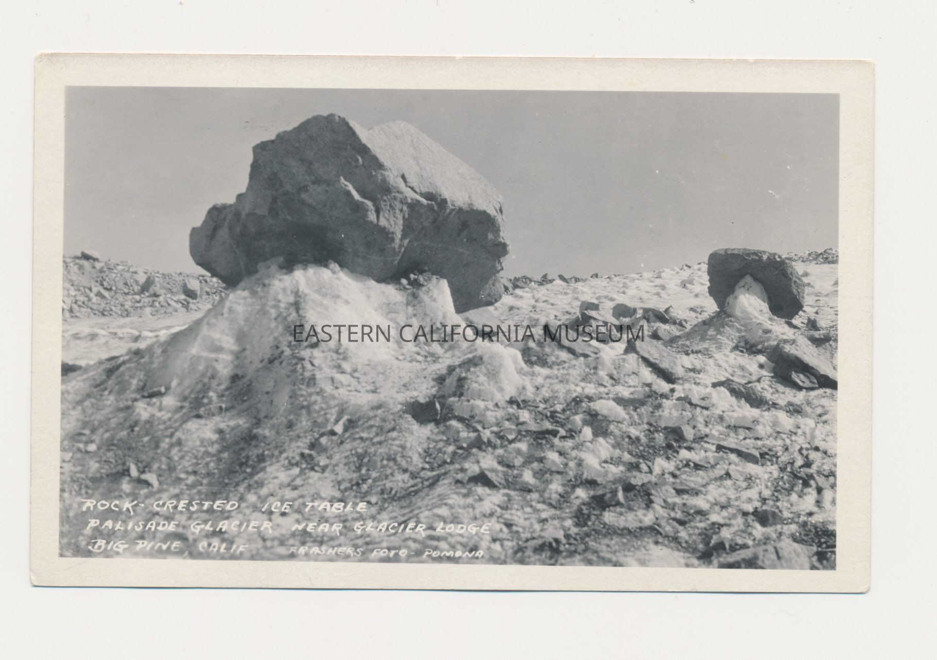 Photo postcard titled, "Rock-Crested Ice Table, Palisade Glacier Near Glacier Lodge, Big Pine, Calif." taken by photographer Burton Frasher of Pomona.Collection