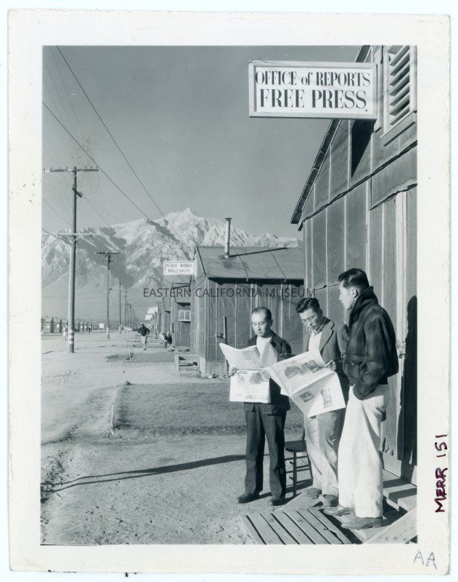 Roy Takeno (Editor) and group reading Manzanar paper [i.e. Los Angeles Times] in front of office, Yuichi Hirata, Nabuo SamamuraEntry/Object ID