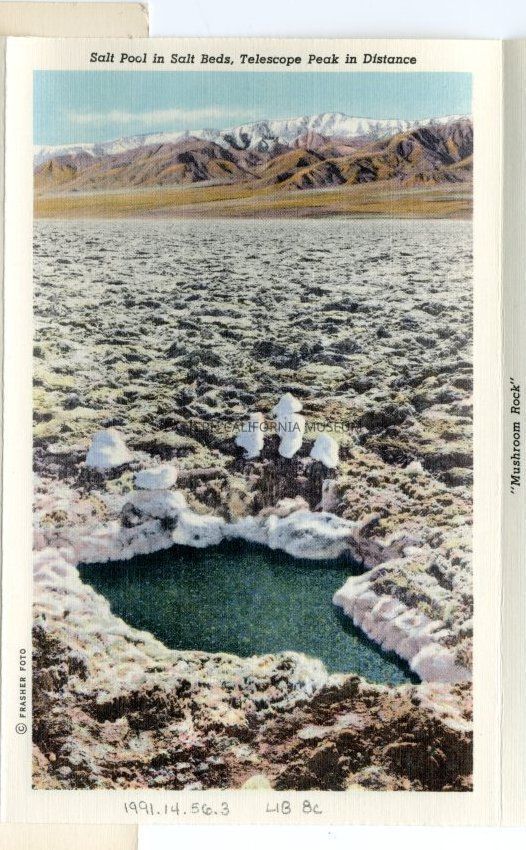 Color print labeled, "Salt Pool in Salt Beds, Telescope Peak in Distance." It is on textured paper.
