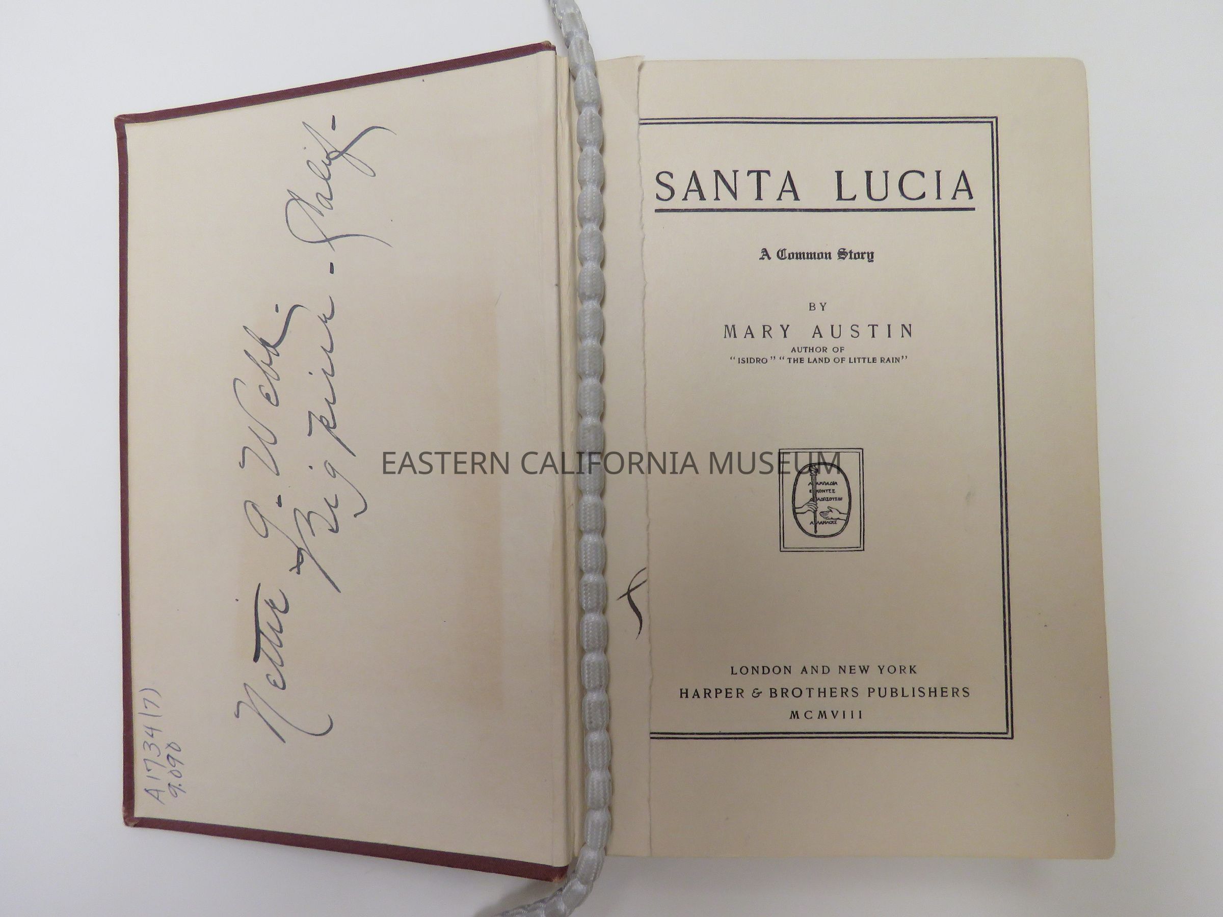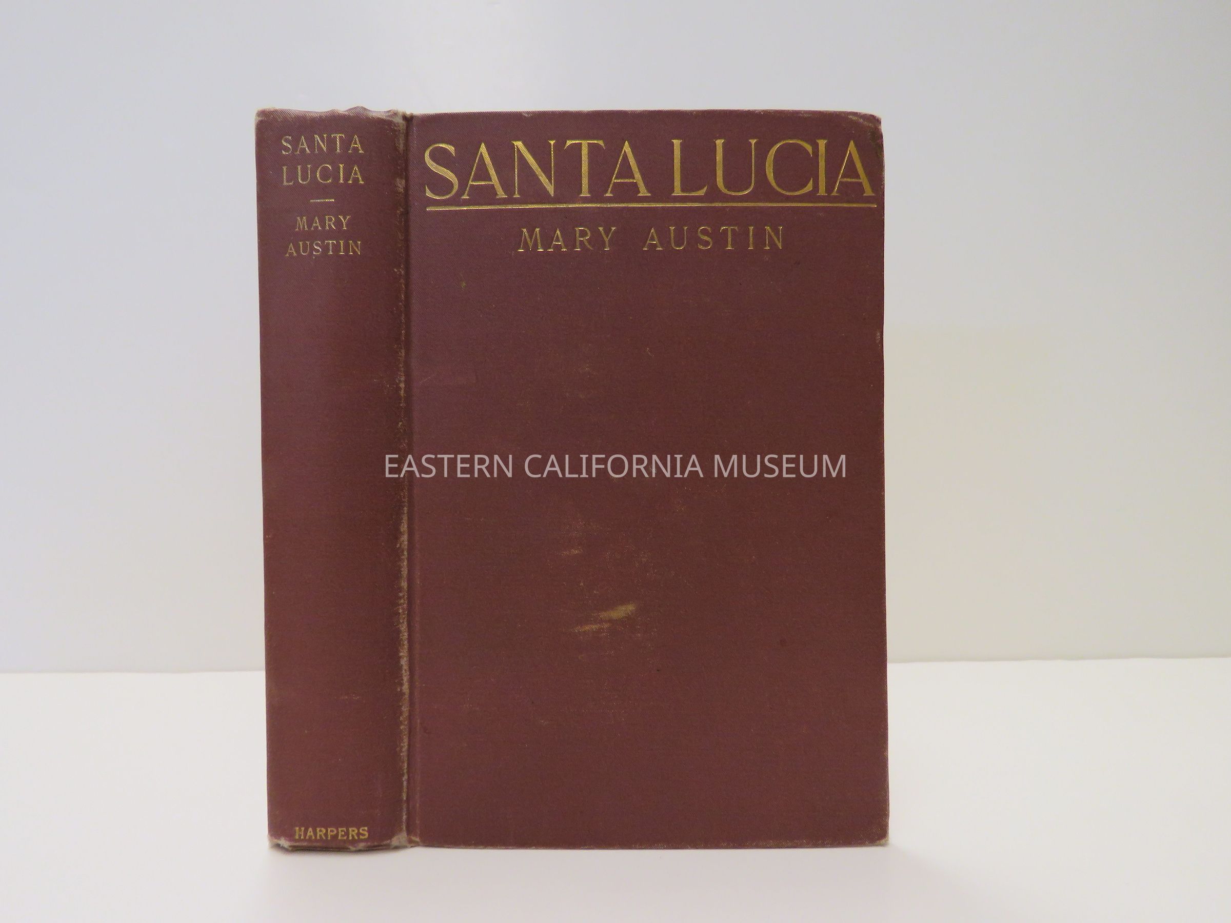 "Santa Lucia: A Common Story" is inscribed on the inside front cover with "Nettie G. Webb, Big Pine, Calif." The front flyleaf is torn out, but there is evidence that there was once writing (an inscription or autograph?) on it. The accession record says this is a 1st edition.Collection