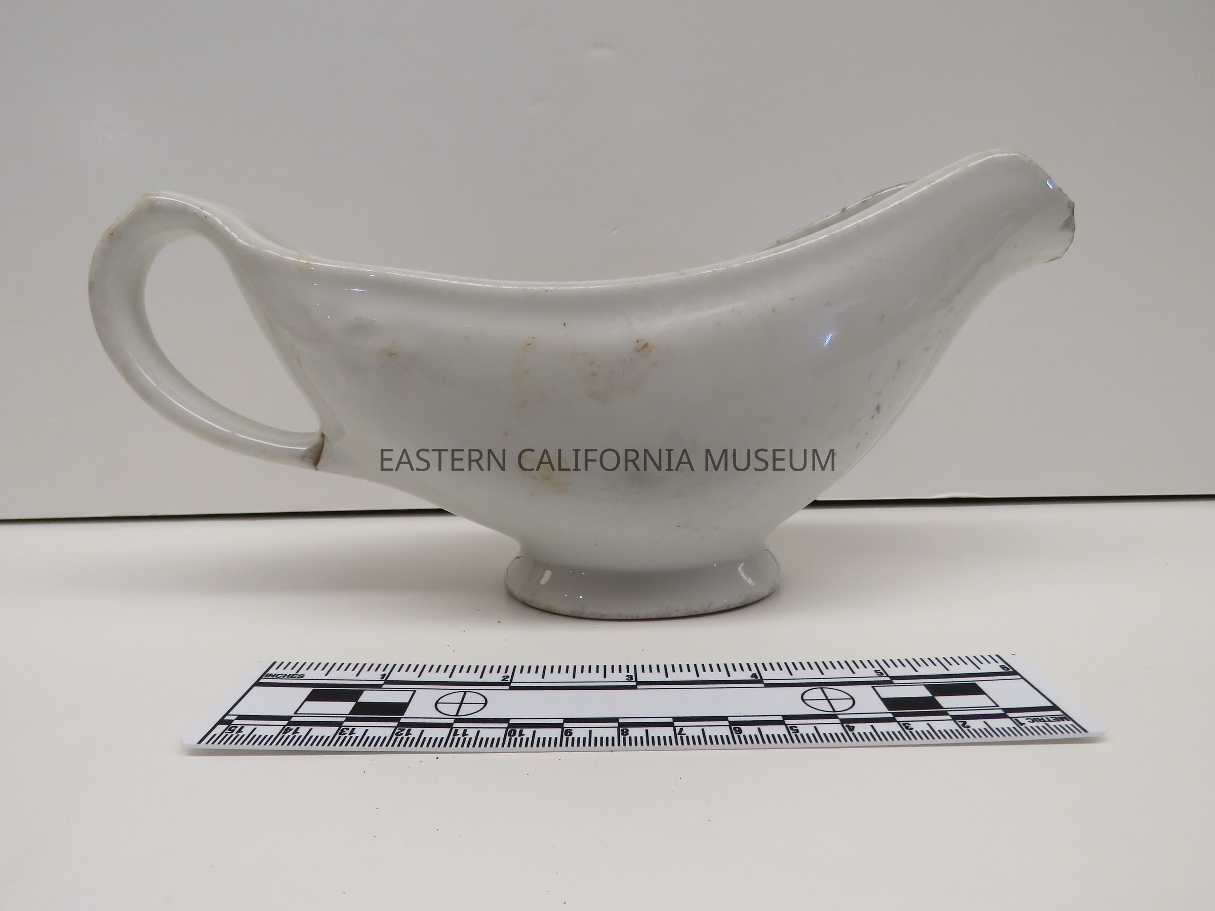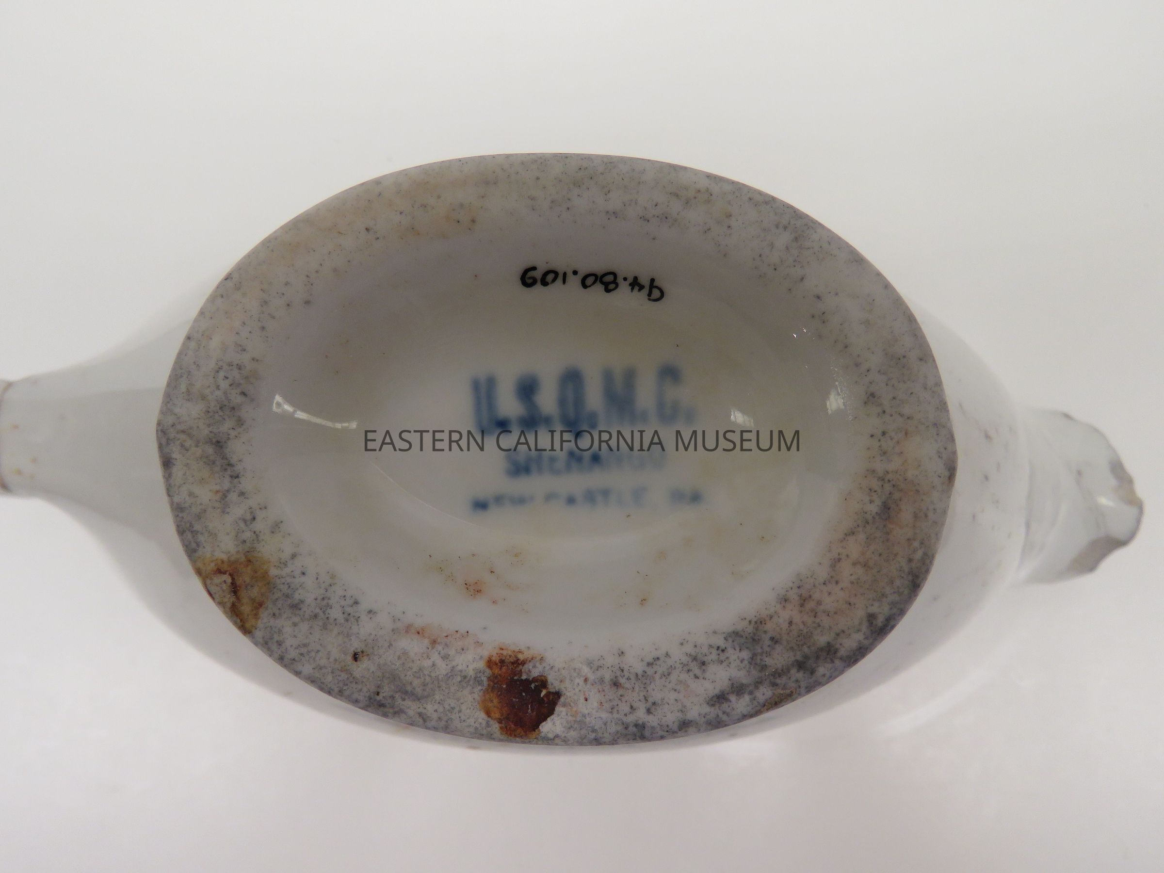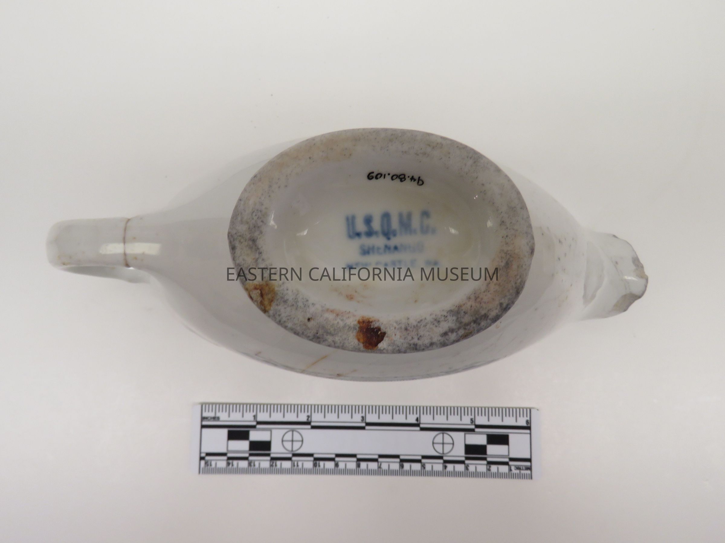 White sauce boat with "U.S.Q.M.C., Shenango, New Castle, PA" stamped on the bottom in blue. The spout is broken off at the tip. It was likely used at Manzanar War Relocation Center.Collection